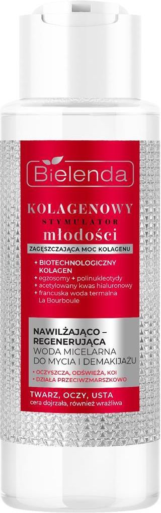 Bielenda Kolagenowy Stymulator Młodości Woda Micelarna Do Demakijażu 400ml Nawilżająco - regenerująca woda micelarna do mycia i demakijażu Bielenda Kolagenowy Stymulator Młodości to wyjątkowy kosmetyk do codziennej pielęgnacji dojrzałej skóry. Skutecznie oczyszcza, usuwa makijaż (również wodoodporny) oraz wszelkie zanieczyszczenia, zapewniając skórze wszystko, czego potrzebuje na etapie oczyszczania. Dzięki zaawansowanej formule o działaniu przeciwzmarszczkowym intensywnie nawilża, regeneruje i koi, pozostawiając cerę świeżą, ukojoną i promienną. Formuła wzbogacona o kluczowe składniki aktywne Biotechnologiczny kolagen – składnik identyczny z ludzkim kolagenem typu III, który wspiera odbudowę struktury skóry, zwiększa jej jędrność i elastyczność, co pomaga w zachowaniu młodzieńczego wyglądu. Molekularne egzosomy – nowoczesne nośniki substancji aktywnych, które przenikają w głębsze warstwy naskórka, aktywując procesy regeneracyjne i stymulując intensywną odnowę komórkową. Polinukleotydy – innowacyjne cząsteczki stymulujące procesy naprawcze skóry, zwiększające jej elastyczność i poziom nawilżenia. Acetylowany kwas hialuronowy – ultra wypełniacz zmarszczek, który widocznie wygładza powierzchnię skóry, dając efekt optycznego wypełnienia i natychmiastowego wygładzenia. Francuska woda termalna La Bourboule – bogata w minerały, wzmacnia barierę ochronną skóry, intensywnie nawilża i łagodzi podrażnienia, przywracając skórze komfort. Efekty stosowania Dokładnie oczyszcza skórę z makijażu i zanieczyszczeń, nie naruszając jej bariery ochronnej. Intensywnie nawilża i odżywia, przywracając skórze miękkość i gładkość. Wspiera regenerację skóry, wygładza zmarszczki i poprawia jej elastyczność. Pozostawia cerę czystą, świeżą, ukojoną i pełną blasku. Stosowanie: Nanieś odpowiednią ilość płynu na wacik i delikatnie oczyść skórę twarzy, oczu i ust. Nie pocieraj mocno i nie spłukuj. Stosuj rano i wieczorem lub w ciągu dnia, aby odświeżyć cerę i zapewnić jej komfort.