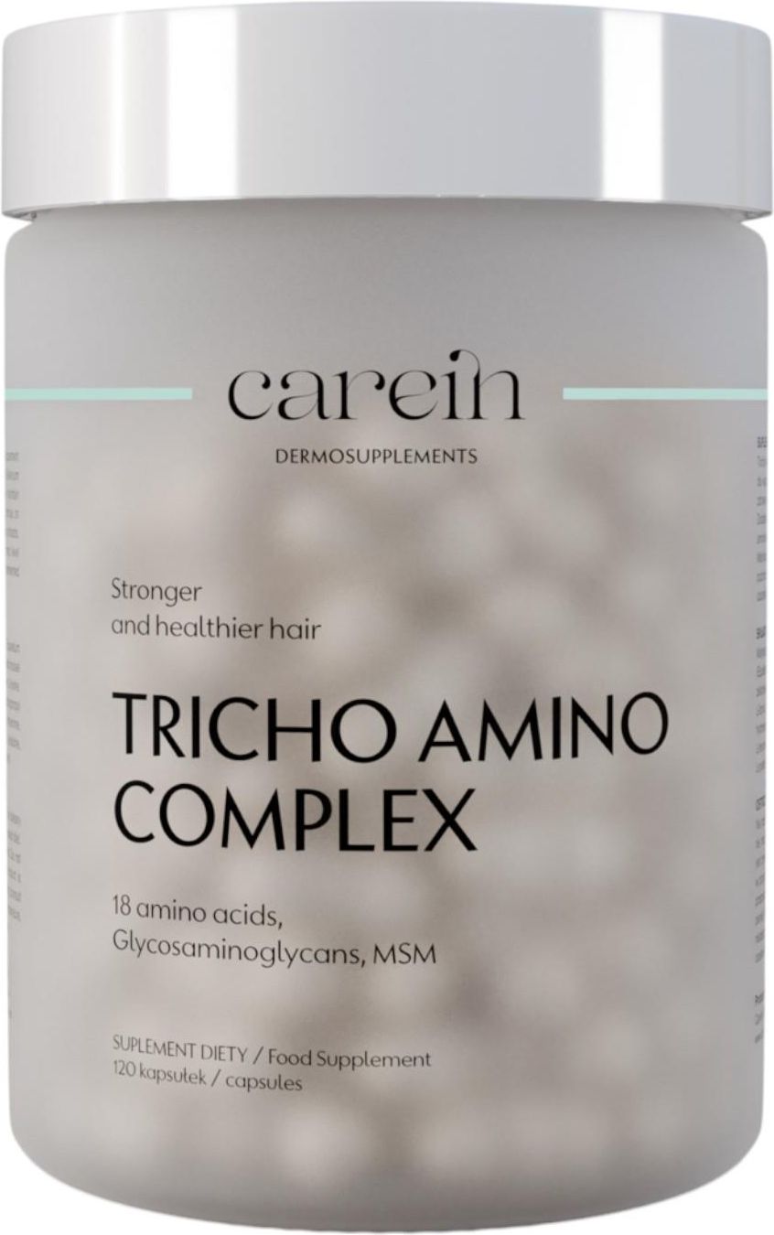 Carein Tricho Amino Complex Kapsułki, 120 szt.Tricho Amino Complex to suplement diety opracowany z myślą o osobach dbających o kondycję włosów. Zawiera kompleks 18 aminokwasów oraz składniki takie jak MSM (organiczna siarka), glikozaminoglikany i ekstrakt ze skrzypu polnego, który jest naturalnym źródłem krzemu. Produkt stanowi uzupełnienie diety w składniki wspierające prawidłowe procesy fizjologiczne zachodzące w organizmie, w tym procesy związane z budową białek strukturalnych. Zawarta w produkcie witamina C wspomaga prawidłową produkcję kolagenu, który wpływa na utrzymanie zdrowej skóry – również w obrębie skóry głowy.Zalecane dzienne spożycie:4 kapsułki dziennieNie należy przekraczać porcji zalecanej do spożycia w ciągu dniaTabela składników aktywnych (porcja 4 kapsułki)Składnik aktywnyIlość% RWS*MSM500 mg–Ekstrakt skrzypu polnego357 mg–– w tym krzemionka249,9 mg–Ekstrakt z zielonego małża nowozelandzkiego200 mg–– w tym glikozaminoglikany4 mg–L-leucyna186 mg–L-lizyna138 mg–L-walina132 mg–L-tyrozyna120 mg–L-glicyna120 mg–L-izoleucyna114 mg–L-seryna114 mg–L-fenyloalanina108 mg–L-treonina108 mg–L-prolina90 mg–L-glutamina70 mg–L-asparaginowy65 mg–L-metionina48 mg–L-histydyna42 mg–L-cysteina30 mg–L-tryptofan24 mg–Selen55 µg100%Biotyna50 µg100%* RWS – referencyjna wartość spożyciaWarunki przechowywania:Suplement diety powinien być przechowywany w miejscu niedostępnym dla małych dzieciPreparat należy przechowywać w temperaturze poniżej 25°CChronić przed wilgocią i bezpośrednim