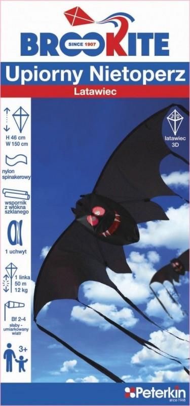 Brookite Latawiec Upiorny nietoperz Producent: Peterkin Kod paskowy (EAN): 5018621033838 UPIORNY NIETOPERZ to fantazyjny, jednolinkowy latawiec 3D, wykonany z nylonu spinakerowego. Posiada wsporniki z włókna szklanego oraz plastikowy uchwyt do nawijania na końcu linki. Przeznaczony do puszczania przy słabym i umiarkowanym wietrze 2-4 BF. Latawiec zapakowany jest w solidny, winylowy futerał z kartonową etykietą oraz instrukcją montażu. Brookite to firma produkująca latwace od 1907 r. Wszystkie latawce uszyte są z lekkich, wysokiej jakości materiałów, używanych między innymi do produkcji żagli. Zawartość produktu LATAWIEC 3D Z NYLONU SPINAKEROWEGO, WSPORNIKI Z WŁÓKNA SZKLANEGO, 1 LINKA, 1 UCHWYT Po rozłożeniu: 46x150cm