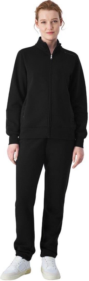 Dres damski Champion czarny 117519 KK001 Właściwości Dres damski Champion sprawdzi się na co dzień. Miękki w dotyku materiał z ocieplanym wnętrzem. Bluza ze stójką i zamkiem na całej długości. Spodnie z lekko zwężanymi ku dołowi nogawkami wykończonymi sznurkiem ściągającym i regulowaną wewnętrznym sznurkiem talią. Boczne kieszenie w bluzie. Spodnie bez kieszeni. Materiał 55% bawełna, 45% poliester z recyklingu