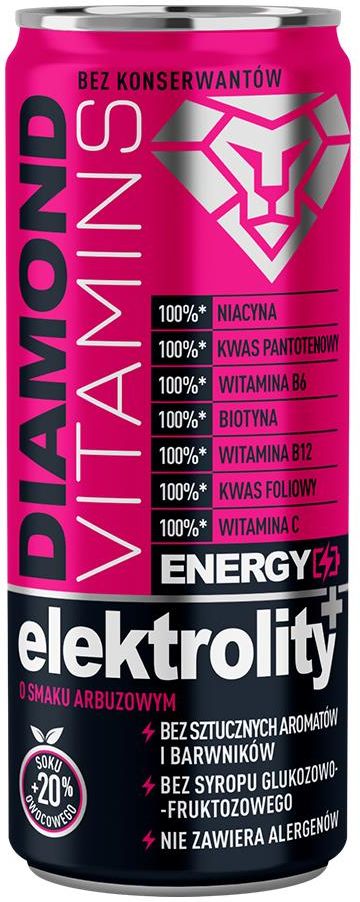 Diamond Vitamins Elektrolity+ to innowacyjny produkt, który dostarcza niezbędne elektrolitów. Zawiera 100% dziennego zapotrzebowania na kluczowe witaminy takie jak niacyna, kwas pantotenowy, witamina B6, biotyna, witamina B12, kwas foliowy i witamina C. Produkt jest wolny od sztucznych aromatów i barwników, nie zawiera syropu glukozowo-fruktozowego oraz alergenów. Smak arbuzowy oraz brak konserwantów sprawiają, że jest to idealny wybór na codzienną dawkę energii i odświeżenia.