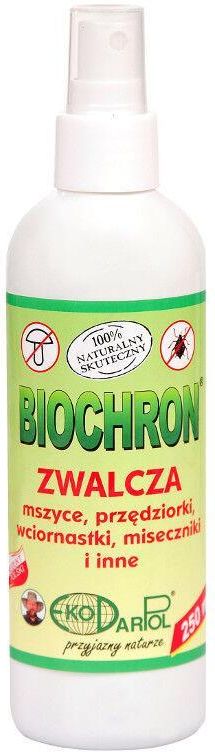 Biochron płynny wyciąg z czosnku 250ml MarkaEKODARPOL Ekodarpol SeriaBiochron Pojemność0,25 L Kod EAN5907520401513SzczegółyPreparat owadobójczy 250 ml marki BIOCHRON to preparat namszyce, przędziorki, wciornastki, miseczniki, mączliki, wełnowce i inne szkodniki oraz różne choroby grzybowe występujące na kwiatach, drzewkach owocowych oraz warzywach. Preparat jest naturalnym wyciągiem z czosnku i octu, dlatego nie szkodzi ludziom i zwierzętom, natomiast warzywa i owoce można spożywać nawet w tym samym dniu po wcześniejszym umyciu. Środek jest gotowym roztworem do użytku bez konieczności rozcieńczania. Przed zastosowaniem należy wstrząsnąć preparatem. Oprysk można stosować profilaktycznie co 7-10 dni, natomiast w sytuacji pojawienia się szkodnika lub choroby stosować nawet codziennie przez 3-5 dni, dokładnie pryskając miejsca wystąpienia owadów, szczególnie w dolnej części liścia. Należy natomiast unikać oprysku płatków kwiatów. W przypadku delikatnych roślin należy zastosować oprysk próbny. Zwróć uwagę na zwroty wskazujące rodzaj zagrożenia oraz przestrzegaj środków bezpieczeństwa zamieszczonych w etykiecie. Dodatkowe informacje:Stosownie do wymogu art. 25 ust. 3 pkt 5 ustawy ośrodkach ochrony roślin z dnia 8 marca 2013 r. ( Dz.U. z 2013 r. poz. 455, t.j. Dz.U. z 2023 r. poz. 340 ) informujemy, że nabycia środków ochrony roślin mogą dokonywać jedynie osoby: a) pełnoletnie, b) posiadające kwalifikacje wymagane od osób nabywających środki ochrony roślin określone w art. 28. przywołanej ustawy. Ze środków ochrony roślin należy korzystać z zachowaniem bezpieczeństwa. Przed każdym użyciem przeczytaj informacje zamieszczone w etykiecie i informacje dotyczące produktu. 5907520401513 026896
