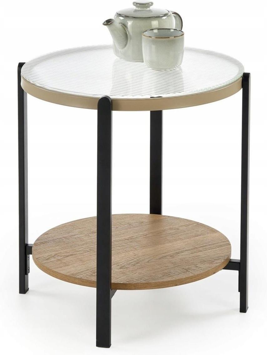Mała okrągła ława KAMALA S Halmar z półką pod blatem Ława Kamala to stylowy i funkcjonalny mebel, który łączy nowoczesny design z praktycznymi rozwiązaniami. Dzięki starannie dobranym materiałom i ponadczasowej kolorystyce, doskonale odnajdzie się w każdej aranżacji – od industrialnych po skandynawskie wnętrza. Jej elegancka, minimalistyczna forma sprawia, że będzie wyjątkową ozdobą każdego salonu, pokoju dziennego czy gabinetu. Solidność i trwałość na lata: Blat wykonany z MDF-u okleinowanego zapewnia trwałość, odporność na codzienne użytkowanie oraz łatwość w utrzymaniu czystości. Transparentna, szklana powierzchnia nadaje lekkości i elegancji, a solidna stalowa konstrukcja malowana proszkowo gwarantuje stabilność oraz wytrzymałość na lata. To mebel, który łączy estetykę z praktycznością w każdym detalu. Dodatkowa półka – więcej miejsca na to, co ważne: Ława Kamala została wyposażona w praktyczną, dolną półkę, która zapewnia dodatkowe miejsce do przechowywania. Idealnie nadaje się na książki, czasopisma, piloty lub inne niezbędne przedmioty, utrzymując porządek w Twoim wnętrzu. Dzięki tej funkcji ława jest nie tylko piękna, ale również wyjątkowo funkcjonalna. Nowoczesny design i naturalna estetyka: Ława o wymiarach 53 x 55 cm wyróżnia się subtelną elegancją, łącząc naturalny odcień blatu z czarną, metalową podstawą. Taka kolorystyka dodaje wnętrzu ciepła i nowoczesnego charakteru, a jednocześnie świetnie komponuje się z różnorodnymi stylami – od klasycznych po loftowe. Główne cechy ławy materiał: szkło / MDF okleinowany / stal malowana proszkowo kolor: naturalny - czarny solidna i stabilna konstrukcja dodatkowa półka na poręczne przedmioty nowoczesny i elegancki design łatwość w utrzymaniu czystości Ława Kamala to idealne połączenie estetyki i funkcjonalności. Dzięki trwałym materiałom, eleganckiemu designowi i praktycznej półce, staje się nie tylko ozdobą, ale także użytecznym elementem Twojego wnętrza. Wybierz ławę Kamala i wprowadź do swojego domu styl oraz wygodę na najwyższym poziomie. Samodzielny montaż: Tak Styl: Klasyczny Dostępna kolorystyka: Naturalny + Czarny Wysokość: 55 Średnica: 53 Materiał: Szkło + metal Blat: Szkło Stelaż: Metal Kolor stelaża: Czarny Rodzaj nóg: Proste Kształt: Okrągły Otwarte półki: 1 otwarta półka Kraj produkcji: Chiny