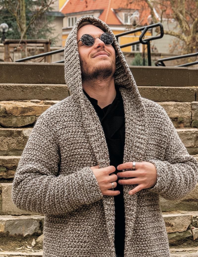 Męski ciepły kardigan bez zapięcia z wełny — boho, hippie, nomad Ciepło, wolność i minimalizm w jednej rzeczy Wydłużony męski kardigan bez zapięć z obszernym kapturem — wybór dla tych, którzy szukają komfortu, funkcjonalności i stylu w duchu boho, etno i współczesnego nomady. Wykonany z wełny o gramaturze 580 g/mb, kardigan łączy w sobie niezawodną ochronę przed zimnem i lekkość noszenia. Jest ciepły, ale nie ciężki. Sprawdzi się zarówno podczas spacerów po mieście, jak i w podróżach, na retreatach czy festiwalach. Skład i materiał Skład: 55% wełna owcza, 45% poliakryl Gramatura materiału: 580 g/mb Technologia: dzianina maszynowa o grubej fakturze Dzięki wysokiej zawartości naturalnej wełny, wyrób posiada właściwości termoregulacyjne i zachowuje ciepło nawet w chłodną pogodę. Poliakryl w składzie dodaje odporności na zużycie, elastyczności i łatwości w pielęgnacji. Zalety modelu Bez zapięć — prostota i uniwersalność Kaptur dużej objętości — ochrona przed wiatrem Wydłużony krój — stylowa sylwetka i komfort Pasuje mężczyznom o różnych typach sylwetki Limitowana partia — tkanina w ograniczonej ilości Uniwersalny kolor beżowy — komponuje się z każdymi podstawowymi rzeczami Jak nosić Kardigan łatwo komponuje się z ubraniami w stylu casual, boho i streetwear: z bawełnianymi koszulami, bluzami z długim rękawem i golfami ze spodniami typu alladynki, jeansami, luźnymi lnianymi spodniami z butami, skórzanymi dodatkami, w wielowarstwowych stylizacjach można zakładać na bluzy z kapturem, koszulki czy swetry Ten wyrób szczególnie nadaje się do tworzenia wielowarstwowych stylizacji — look łatwo dostosować do temperatury i nastroju. Zalecenia pielęgnacyjne Pranie ręczne w temperaturze 30°C Dopuszczalne pranie maszynowe w programie „wełna/kaszmir" z żelem do prania delikatnego Nie stosować proszków i kapsułek Suszyć wyłącznie w sposób naturalny, nie na kaloryferze