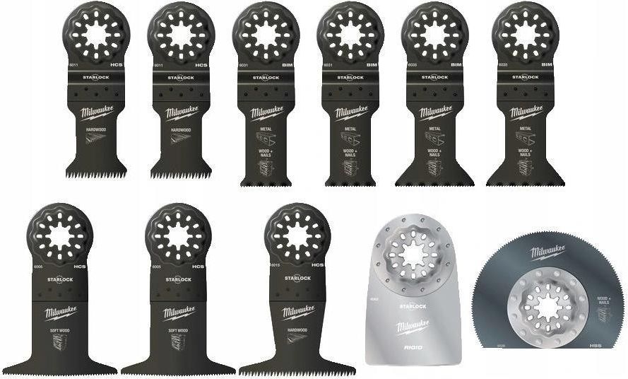 MILWAUKE ZESTAW 8SZT. BRZESZCZOTÓW DO NARZĘDZIA WIELOFUNKCYJNEGO Zawartość zestawu 2 x brzeszczot bimetalowy 28mm nr 48906031 - cięcie wgłębne wielu materiałów 2 x brzeszczot bimetalowy 43mm nr 48906035 - cięcie wgłębne wielu materiałów 1 x nóż z 3 krawędziami tnącymi do wykładzin , kartonu i papy dachowej 48906060 1 x elastyczny skrobak do usuwania pozostałości 48906061 1 x tarnik z ostrzem z węglika spiekanego do szlifowania zgrubnego nr 48906054 1 x ostrze do usuwania fug 2,2mm nr 48906051 Wszystkie ostrza z uniwersalnym uchwytem typu STARLOCK pasującego do większości marek urządzeń wielofunkcyjnych Wszystkie ostrza zapakowane w plastikowe etui Bimetalowe ostrze do cięcia wgłębnego 28mm nr 48906031 Ostrze z węglika spiekanego do usuwania fug 2,2mm nr 48906051 Tarnik z ostrzem z węglika spiekanego do szlifowania zgrubnego nr 48906054 Elastyczny skrobak do usuwania pozostałości nr 48906061 Nóż z 3 krawędziami tnącymi do wykładzin , kartonu i papy dachowej nr 48906060