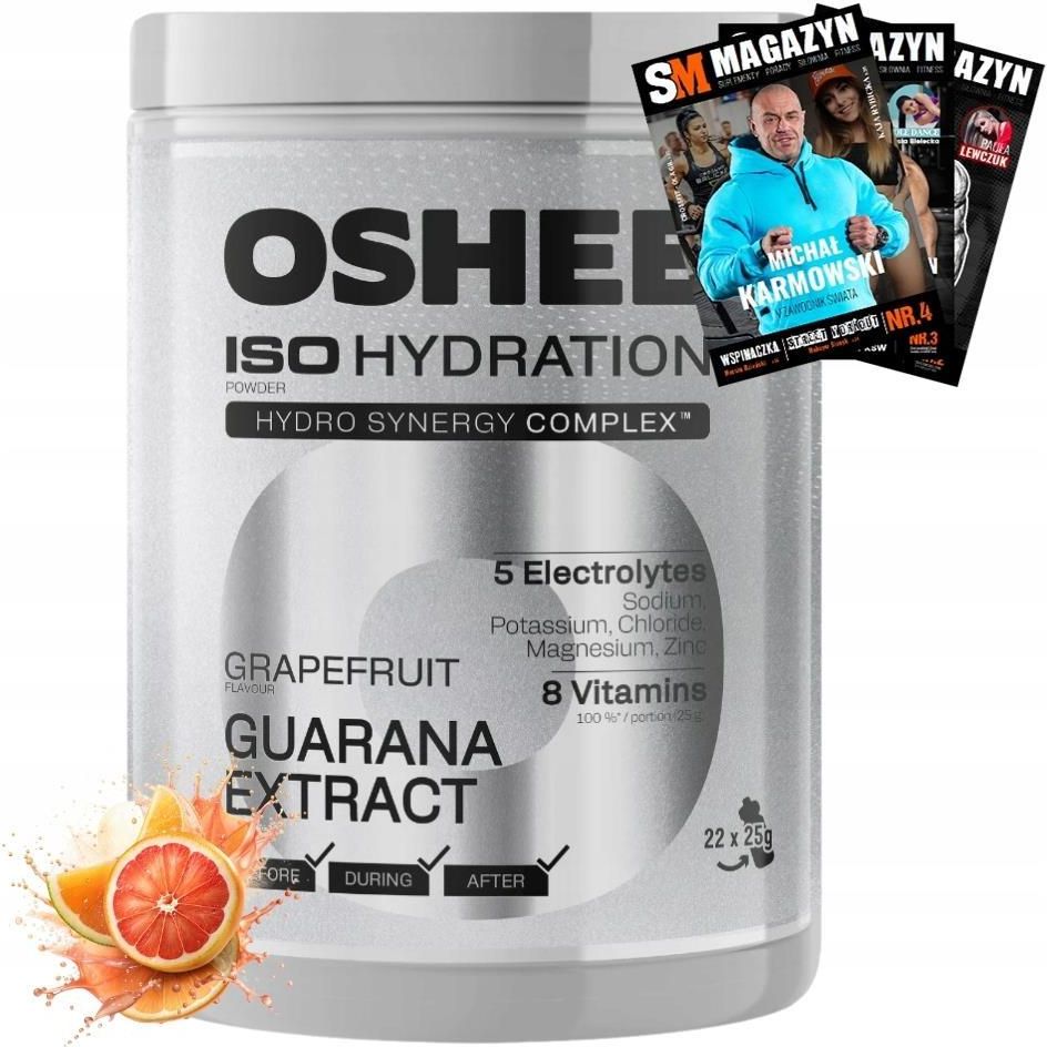 OSHEE ISO Hydration izotonik w proszku grapefruit guarana 550 g Maksymalna wydajność, skuteczne nawodnienie i naturalna energia!. Opakowanie: 550 g = 22 porcje W opakowaniu znajduje się miarka do odbierzania porcji. 1 porcja na 500 ml wody. OSHEE ISO Hydration izotonik w proszku grapefruit guarana Maksymalna wydajność, skuteczne nawodnienie i naturalna energia! OSHEE ISO Hydration Grapefruit Guarana to innowacyjny izotonik w proszku, stworzony dla sportowców, osób aktywnych fizycznie oraz wszystkich, którzy potrzebują dodatkowego pobudzenia podczas intensywnego wysiłku. Formuła łącząca węglowodany, elektrolity i ekstrakt z guarany – naturalnego źródła kofeiny – wspiera koncentrację, poprawia wytrzymałość i pomaga zmniejszyć uczucie zmęczenia. Orzeźwiający, grejpfrutowy smak doskonale gasi pragnienie. Wymieszaj z wodą i ciesz się pełnią energii! OSHEE Hydration doskonale nawadnia, dostarczając przy tym wszystkich niezbędnych elektrolitów, witamin oraz guarany potrzebnych do regeneracji i prawidłowego funkcjonowania organizmu. Większe opakowanie = więcej treningów! 550 g = 22 porcje – wystarczy na dłużej, dając Ci wygodę i pewność, że masz pod ręką skuteczny izotonik. Wymieszaj w wodzie i ciesz się smakiem oraz nawodnieniem! Jedną porcję 25 g proszku zalecamy wymieszać z 500 ml wody. Hydro Synergy Complex Unikatowa formuła Hydro Synergy Complex™ to kompleks elektrolitów i witamin, opracowany we współpracy ze sportowcami, aby odpowiadać na rzeczywiste potrzeby organizmu podczas intensywnego wysiłku. To precyzyjnie dobrany zestaw składników, które wspierają nawodnienie, regenerację oraz utrzymanie optymalnej wydolności organizmu. Regularne stosowanie produktów z Hydro Synergy Complex™ pomaga utrzymać prawidłowe funkcjonowanie mięśni, wspiera równowagę wodno-elektrolitową i sprzyja Już jedna porcja produktu dostarcza Elektrolity 300 mg potasu – wspiera utrzymanie optymalnego ciśnienia krwi, kluczowego dla zdrowia układu krążenia 60 mg magnezu – pomaga zachować równowagę elektrolitową i wspiera prawidłową pracę mięśni 1,5 mg cynku – niezbędny w procesie syntezy białek, wspomaga regenerację i odbudowę mięśni 120 mg chlorków – wspiera gospodarkę wodno-elektrolitową, ułatwiając utrzymanie odpowiedniego nawodnienia 360 mg sodu – istotny dla regulacji poziomu płynów w organizmie i efektywnego nawodnienia Kompleks witamin Witamina B1 – odpowiedzialna za pracę układu nerwowego i serca Niacyna – pomaga zmniejszyć uczucie zmęczenia i znużenia Witamina B6 – wspomaga metabolizm białek i glikogenu Kwas foliowy – bierze udział w procesach wzrostu i regeneracji komórek Witamina B12 – odpowiada za prawidłowe funkcjonowanie układu nerwowego Biotyna – korzystnie wpływa na nasz układ nerwowy Kwas pantotenowy – przyczynia się do prawidłowej sprawności umysłowej Witamina C – odpowiedzialna za odporność w trakcie i po wysiłku OSHEE ISO Hydration w proszku Grapefruit Guarana 1050 g – Twój niezawodny wybór! Zaawansowana formuła – stworzona zarówno dla profesjonalnych sportowców, jak i osób aktywnych fizycznie, które potrzebują skutecznego wsparcia. Kompleks elektrolitów (sód, potas, magnez, chlorki, cynk) – wspomaga prawidłową pracę mięśni i utrzymanie równowagi wodno-elektrolitowej. Witaminy z grupy B + witamina C – pomagają zmniejszyć uczucie zmęczenia i wspierają metabolizm energetyczny, zapewniając dodatkową dawkę energii. Łatwo rozpuszczalny proszek – wygodna forma pozwala na szybkie przygotowanie napoju i dostosowanie porcji do Twoich potrzeb. Idealny wybór dla każdego, kto chce maksymalnie zadbać o nawodnienie i regenerację! OSHEE ISO Hydration Lemon BCAA proszek – idealny wybór dla Osób aktywnych fizycznie, które potrzebują dodatkowego pobudzenia Sportowców szukających wsparcia w regeneracji i nawodnieniu Osób, które chcą poprawić wytrzymałość i skupienie podczas treningu Osób narażonych na intensywny wysiłek fizyczny Hydration No.1 – regeneracja, wytrzymałość i nawodnienie na najwyższym poziomie Składniki glukoza, regulator kwasowości – kwas cytrynowy, cytrynian sodu, cytrynian potasu, chlorek potasu, węglan magnezu, ekstrakt z nasion guarany (Paullinia cupana), witamina C (kwas l-askorbinowy), tiamina (monoazotan tiaminy), niacyna (amid kwasu nikotynowego), kwas pantotenowy (D-pantotenian wapnia), witamina B6 (chlorowodorek pirydoksyny), biotyna ( D-biotyna), kwas foliowy (kwas pteroilomonoglutaminowy), witamina B12 (cyjanokobalamina), aromaty, diglicynian cynku, substancja słodząca – acesulfam K. Może zawierać zboża zawierające gluten, soję oraz mleko Wartość odżywcza w 100 g / 15 g (porcja) Wartość energetyczna: 1360 kJ (320 kcal )/ 340 kJ (80 kcal) Tłuszcz: 0 g / 0 g w tym kwasy tłuszczowe nasycone 0 g / 0 g Węglowodany: 80 g / 20 g w tym cukry: 80 g / 20 g Białko: 0 g / 0 g Sól: 3,6 g / 0,9 g Składniki aktywne Witamina C: 320 mg (400%*) / 80 mg (100%*) Tiamina: 4,4 mg (400%*) / 1,1 mg (100%*) Niacyna B3: 64 mg (400%*) / 16 mg (100%*) Witamina B6: 5,6 mg (400%*) / 1,4 mg (100%*) Kwas foliowy: 800 μg (400%*) / 200 μg (100%*) Witamina B12: 10 μg (400%*) / 2,5 μg (100%*) Biotyna (B7): 200 μg (400%*) / 50 μg (100%*) Kwas pantotenowy: 24 mg (400%*) / 6 mg (100%*) Ekstrakt z nasion guarany: 400 mg / 100 mg W tym kofeina: 88 mg / 22 mg Potas: 1200 mg ( 60%*) / 300 mg (15%*) Chlor: 480 mg (60%*) / 120 mg ( 15%*) Magnez: 240 mg ( 64%*) / 60 mg (16%*) Cynk: 6 mg (60%*) / 1,5 mg (15%*) Sód: 1440 mg / 360 mg Ekstrakt z nasion guarany: 666,7 mg / 100 mg w tym kofeina: 146,7 mg / 22 mg *% dziennej referencyjnej wartości spożycia dla osoby dorosłej