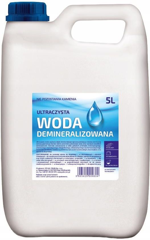 ULTRACZYSTA WODA DEMINERALIZOWANA 5L Nie pozostawia kamienia DO ŻELAZEK • DO SAMOCHODU • DO LABORATORIUM • DO ZASTOSOWAŃ TECHNICZNYCH Ultraczysta woda uzyskana dzięki demineralizacji najnowocześniejszą metodą odwróconej osmozy gwarantuje bardzo dobre parametry jakościowe wody oraz usunięcie wszelkich zanieczyszczeń. Szerokie zastosowanie w wielu gałęziach przemysłu motoryzacyjnego, chemicznego, kosmetycznego, fotograficznego, akwarystycznego czy farmaceutycznego. Doskonała do żelazek, nawilżaczy powietrza, farb wodorozcieńczalnych, kosmetyków oraz płynów do dezynfekcji. ZASTOSOWANIE do produkcji płynów do dezynfekcji, w akumulatorach i układach chłodzących, do rozcieńczania koncentratów płynów do chłodnic i plynów do spryskiwaczy oraz innych substancji chemicznych w motoryzacji i przemyśle, w klimatyzacji, dla celów laboratoryjnych, w procesach stomatologicznych i analitycznych, w pralniach i prasowalniach przemysłowych, w gospodarstwach domowych np. do żelazek, nawilżaczy powietrza, w akwarystyce, w klasycznej fotografice, do wytwornic pary.
