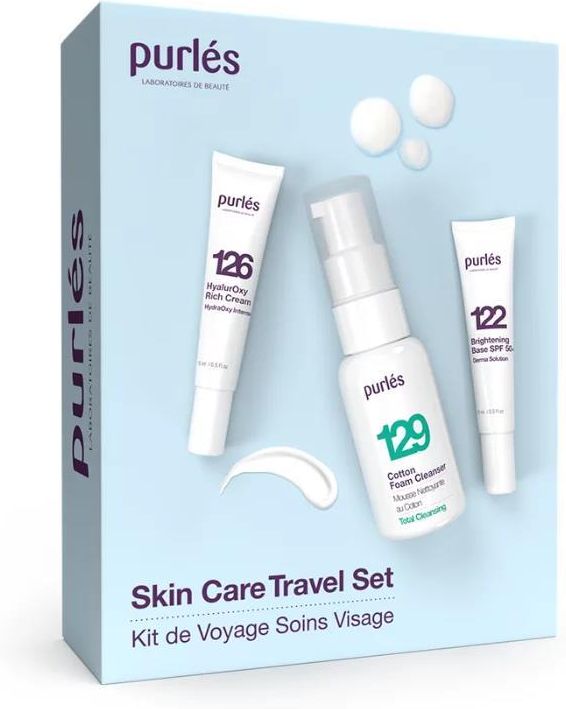 PURLES ZESTAW PODRÓŻNY produkty 122 10ml 126 15ml 129 50ml TRAVEL SET 122 Brightening Base SPF 50+ 10ml Krem-baza przeznaczony do kompleksowej pielęgnacji każdego rodzaju cery. Ultralekka, aksamitna formuła zapewnia subtelne rozświetlenie, wielowymiarową pielęgnację i perfekcyjną ochronę skóry przed promieniami UV. Unikalny kompleks łagodzi podrażnienia, zmniejsza zaczerwienienia wywołane podrażnieniem skóry oraz zapewnia przyjemny efekt kojący. Po zastosowaniu kremu, cera jest optymalnie wygładzona, odżywiona i pełna blasku. Nie zawiera parabenów, nie zawiera SLS/SLES, nie zawiera olei mineralnych, wegański, nie zawiera substancji z grupy PEG, przyjazny zwierzętom, bez modyfikacji genetycznych, nie zawiera trietanoloaminy, nie zawiera glutenu 126 HyalurOxy Rich Cream 15 ml Bogata i aksamitna konsystencja gwarantuje komfort stosowania. Kwas hialuronowy i gliceryna pochodzenia naturalnego przywracają skórze nawilżenie. Działanie przeciwstarzeniowe zapewnia zaawansowany Glycokin Complex, który stymuluje syntezę wielu ważnych struktur budujących skórę. Ekstrakt z brązowych alg wzmacnia efekt anti-aging, dodatkowo dotlenia skórę. Zapewnia jej to ujędrnienie, wygładzenie oraz redukuje objawy starzenia się. Dominują składniki naturalnego pochodzenia, nie zawiera parabenów, nie zawiera SLS/SLES, nie zawiera olei mineralnych, wegański, przyjazny zwierzętom, bez modyfikacji genetycznych, nie zawiera trietanoloaminy, nie zawiera glutenu. 129 Cotton Foam Cleanser 50 ml Oczyszczanie skóry twarzy jest niezwykle ważną kwestią. W ciągu dnia osadzają się na niej zanieczyszczenia w postaci kurzu, a także nadmiar łoju. Jeśli na co dzień się malujemy, musimy również dokładnie usunąć makijaż przed pójściem spać. Jednym z kosmetyków, który pomoże w pielęgnacji twarzy jest Purles Cotton Foam Cleanser! To innowacyjny produkt, w postaci pianki do oczyszczania twarzy i do demakijażu. Dzięki swoim składnikom, pianka nie podrażnia skóry, dlatego idealnie nadaje się nawet do tej wrażliwej. W swoim składzie zawiera ekstrakt z bawełny, który ma właściwości przeciwzapalne, regeneruje i nawilża skórę, kwas hialuronowy silnie nawilża i zmniejsza widoczność zmarszczek, a gliceryna roślinna sprawia, że skóra twarzy jest elastyczna, błyszcząca i wygładzona. Używając pianki, skóra będzie jędrna i zabezpieczona przed szkodliwym działaniem czynników zewnętrznych. Jej wspaniałe właściwości sprawiają, że idealnie nadaje się do codziennego stosowania!