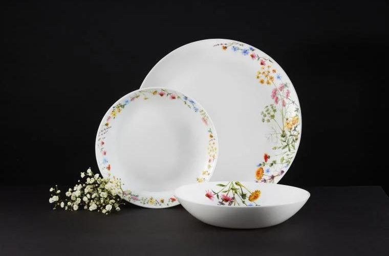Serwis obiadowy dla 6 osób Bloom 18-elementowy AMBITION Serwis obiadowy szklanySerwis obiadowy Bloom to harmonijne połączenie subtelności natury z nowoczesnym wykonaniem. Wykonany ze szkła opalowego, zapewnia wyjątkową trwałość, odporność na zarysowania i łatwe czyszczenie, a przy tym prezentuje się niezwykle lekko i świeżo. Dekoracyjny wzór w postaci polnych kwiatów nadaje każdemu posiłkowi wyjątkowego uroku, wprowadzając do jadalni sielski klimat letniego ogrodu. Zestaw talerzy Bloom to idealne rozwiązanie zarówno na rodzinne obiady, jak i świąteczne przyjęcia. Dzięki stonowanej kolorystyce i delikatnemu zdobieniu, świetnie wpisuje się w różnorodne style wnętrz – od rustykalnych po nowoczesne aranżacje.•Materiał: wytrzymałe szkło opalowe odporne na zarysowania i uszkodzenia•Dekoracja: subtelny, kwiatowy wzór inspirowany naturą•Funkcjonalność: idealny do codziennego użytku i okazjonalnych spotkań•Łatwość czyszczenia: gładka powierzchnia zapobiega przywieraniu zabrudzeń•Design: kolekcja łącząca lekkość i delikatność formy z praktycznym zastosowaniem Dane techniczne•Marka - Ambition•Kolekcja - Bloom•Waga [kg] - 5.7•Materiał - Szkło•Zastosowanie - Kuchenka mikrofalowa, Zmywarka•Funkcja - Sztaplowane•Kolor - biały, wielokolorowy•Wzór - motyw roślinny Skład zestawu:6x talerz obiadowy 24 cm6x talerz deserowy 19 cm6x talerz do zupy 20 cm 5907078407517 Ze względu na ręczne pomiary możliwe jest niewielkie odchylenie pomiarowe. Ze względu na różne efekty oświetlenia i ustawienia ekranu kolor produktu może się nieznacznie różnić od rzeczywistego koloru.