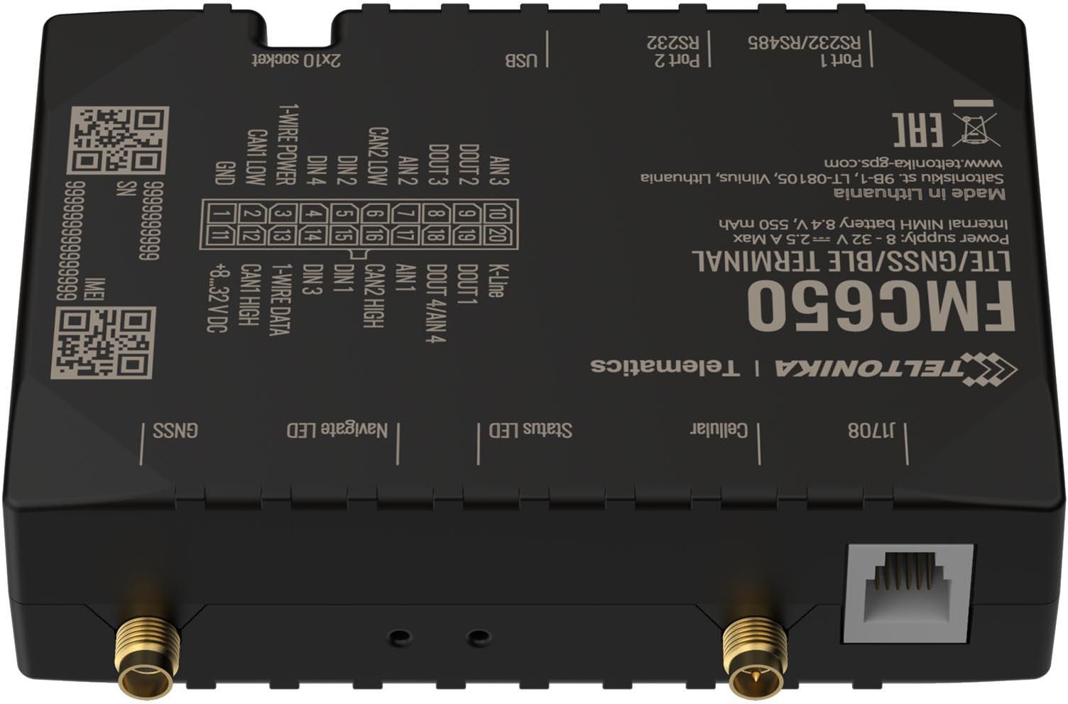 Teltonika FMC650 to profesjonalny terminal LTE/GNSS. Teltonika FMC650 lokalizator 4G LTE Cat 1 do zaawansowanych zastosowań z baterią zapasową o dużej pojemności i antenami zewnętrznymi. Niezawodny globalny zasięg i oddzielny moduł GNSSNiezawodne połączenie 4G z możliwością powrotu do sieci 2G zapewnia szerokie pokrycie potrzeb związanych z zarządzaniem flotą. Model ten wykorzystuje oddzielny moduł do gromadzenia danych GNSS i obsługuje dwa kanały, L1 + L5. Zdalne pobieranie plików tachografu i danych na żywoOdczyt danych na żywo z tachografu za pośrednictwem połączeń K-Line, Tacho CAN lub FMS do codziennego zarządzania kierowcą i wydajnością floty. Odczyt danych CAN z ciężkich pojazdów i maszyn specjalnychOdczyt danych J1939 obejmujących standard CAN FMS z ciężkich pojazdów, takich jak ciężarówki, oraz nieprzetworzonych danych J1939 z maszyn specjalnych, takich jak dźwigi budowlane lub autobusy elektryczne. Możliwość podłączenia do linii CAN z wieloma węzłami. Podłączanie urządzeń zewnętrznych2x RS232 i 1x RS485 szeregowe interfejsy komunikacyjne do podłączania urządzeń zewnętrznych, takich jak termografy, czujniki, czytniki RFID i inne. Teltonika FMC650 (FMC6501TFE01) obsługuje pasma: 4G (LTE FDD): B1/B3/B7/B8/B20/B28 4G (LTE TDD): B38/B40/B41 2G (GSM): B2/B3/B5/B8 Zawartość zestawu: Tracker FMC650 Kabel zasilający wejścia/wyjścia (0.9m) Antena 4G/GSM (3m) Antena GNSS (3m) Pudełko z logo Teltonika Najważniejsze cechy: Niezawodne połączenie 4G z możliwością powrotu do sieci 3G i 2G Bluetooth dla zewnętrznych urządzeń i czujników Odczyt danych CAN z pojazdów i transportu specjalistycznego Dual SIM – znacznie obniża koszty roamingu Interfejsy komunikacji szeregowej RS232/RS485 Zdalne pobieranie plików i danych z tachografu Module Name: SLM320-E2, SLM320-LA Technology: LTE (CaT1) / 2G (GSM / GPRS) / GNSS GNSS Module name: Airoha AG3335MB GNSS: GPS, GLONASS, GALILEO, BEIDOU, QZSS Receiver: L1 and L5 dual-band GNSS receiver Tracking sensitivity: -165 dBM Position Accuracy: < 2.5 m CEP Hot start: 1 s Warm start: < 25 s Cold start: < 32 s Cellular Technology: LTE Cat 1, GSM 2G bands: SLM320-E2: B2/B3/B5/B8 / SLM320-LA: B2/B3/B5/B8 4G LTE Cat 1 bands: SLM320-E2 LTE-FDD:B1/B3/B7/B8/B20/B28, LTE-TDD:B38/B40/B41 / SLM320-LA: LTE-FDD:B1/B2/B3/B4/B5/B7/B8/B20/B28, LTE-TDD:B40 Data transfer: LTE FDD: Max 10Mbps (DL)/Max 5Mbps (UL) LTE TDD, Max 8Mbps (DL), Max 2Mbps (UL) GPRS:, Max 85.6Kbps (DL)/Max 85.6Kbps (UL) Data support: SMS (text/data) Power Input voltage range: 8–32 V DC with overvoltage (compatible with pulse 5a and pulse 5b) and reverse polarity protection Internal Back-up battery: 550 mAh Ni-Mh, 8.4 V battery Power consumption: At 12V <7 mA (Deep Sleep), At 12V <13 mA (Online Deep Sleep), At 12V < 47 mA (GPS Sleep), At 12V < 68 mA (Normal) Bluetooth Name: Blue NRG232 Specification: 5.0 + LE Supported peripherals: Temperature and Humidity sensor, Universal BLE sensors support Physical specification Dimensions: 104,1 x 76,8 x 31,5 mm (L x W x H) Weight: 197 g Operating environment Operating temperature (without battery): -40 °C to +85 °C Storage temperature (without battery): -40 °C to +85 °C Operating humidity: 5% to 95% non-condensing Storage temperature (with battery): -20 °C to +45 °C Ingress Protection Rating: IP41 Battery storage temperature: -20 °C to +45°C Interface Digital Inputs: 4 Digital Outputs: 4 Analog Inputs: 4 1-Wire: 1 RS232: 2 RS485: 1 CAN J1939: 2 J1708: 1 K-line: 1 GNSS antenna: External High Gain (L1+L5) Cellular antenna: External High Gain USB: 2.0 Mini-USB – device can be powered by USB for easier device configuration LED indication: 2 status LED lights SIM: 2x SIM Card (Dual-SIM) or 1x eSIM Memory: 16 MB internal flash memory and external Micro SD card up to 32GB Switchable CAN terminators: Supported on CAN1 and CAN2 lines Features Sensors: Accelerometer Scenarios: Green/Eco Driving, Over Speeding detection, Jamming detection, Excessive Idling detection, Towing detection, Crash detection, Immobilizer, iButton Read Notification, Auto Geofencing, Manual Geofencing, Trip detection, Odometer, Fuel counter, GNSS Unplug Detection, DDD download and Tacho online data, Offline tracking Supported peripherals: Garmin, RFID RS232, RFID 1-Wire, iButton 1-Wire, Temperature 1-Wire, LV-CAN200, CAN FMS (J1939, J1708), K-line data, Continental tire pressure measurement sensor, Iridium SBD (Iridium Edge/TSM232), Carrier freezer, Log Mode, NMEA, TCP ASCII/Binary, Temperature and humidity sensor, Universal BLE sensors support Sleep modes: GPS Sleep, Online Deep Sleep, Deep Sleep Configuration and firmware update: FOTA Web, FOTA, Teltonika Configurator SMS: Configuration, Events, DOUT control, Debug GPRS commands: Configuration, DOUT control, Debug Time Synchronization: GNSS, NITZ, NTP Fuel monitoring: LLS (Analog), Digital LLS (RS232, RS485), LV-CAN200, CAN FMS, Ultrasonic level sensor Ignition detection: Digital Input, Accelerometer, External Power Voltage RS232 Modes: Log Mode, NMEA, LLS, LCD, RFID HID/MF7, Garmin FMI, TCP ASCII/Binary, TCP ASCII/Binary (Buffered), Rec to LCD, Atol Tachograph, UL202-2 Fuel Sensor, Iridium Edge/TSM232 Satellite backup, Carrier Freezer RS485 Modes: Silent, Log Mode, NMEA, LLS, TCP ASCII/Binary, TCP ASCII/Binary (Buffered) Certification & approvals Regulatory: CE/RED, E-Mark, RCM, Pulse 5a