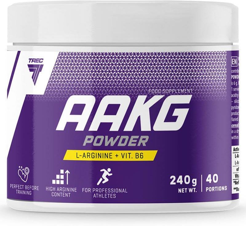 TREC | AAKG POWDER | 240g Alfa-ketoglutaran L-Argininy - Najlepiej przyswajalna forma Zwiększa ukrwienie mięśni i nasila transport tlenu i składników odżywczych zwiększać efektywność treningową potęguje produkcję i uwalnianie tlenku azotu (pompa mięśniowa) AAKG w proszku zostało wzbogacone o witaminę B6 i L-argininę. Zawarta w suplemencie Witamina B6 przyczynia się do utrzymania prawidłowego metabolizmu energetycznego oraz zmniejszenia uczucia zmęczenia i znużenia. AAKG Powder światowej klasy preparat przedtreningowy, w którego każdej porcji znajdziesz potężną dawkę AAKG (alfa-ketoglutaranu l-argininy). Sprzyja on maksymalizacji pompy mięśniowej, co przekłada się na wiele wymiernych korzyści dla organizmu. Nie jest to zatem tylko efekt wizualny podnoszący poziom motywacji do dalszej walki o wymarzoną sylwetkę i cele. Poprawa ukrwienia i zwiększenie przepustowości naczyń krwionośnych sprzyja sprawniejszemu odżywieniu i dotlenieniu komórek, co przekłada się na lepszą regenerację powysiłkową. Oczywiście nie jest to bez znaczenia dla jakości umięśnienia i szybkości jego rozwoju. Co daje regularne stosowanie AAKG? Zwiększa produkcję tlenku azotu Potęguje efekt pompy mięśniowej podczas treningu Obniża ciśnienie tętnicze Pozytywnie wpływa na libido oraz zdolności seksualne Zwiększa wytrzymałość mięśniową Zawarta w tym suplemencie witamina B6 przyczynia się do: Utrzymuje prawidłowego metabolizmu energetycznego, Zmniejsza uczucia zmęczenia i znużenia, Pomaga zachować prawidłowych funkcji psychologicznych*. Bardzo dobrze się rozpuszcza i szybko przyswaja, zapewniając maksymalizację efektu pompy mięśniowej. Jest to jeden z najlepszych preparatów skierowanych do najbardziej wymagających sportowców. Formuła została ponadto wzbogacona o dodatek witaminy B6, której wpływ na prawidłowe tempo przemian energetycznych jest nie do pominięcia. Komu polecane jest stosowanie AAKG? AAKG Powder może być stosowany przez zawodowców, jak i osoby trenujące amatorsko - szczególnie sporty typowo siłowe i siłowo-wytrzymałościowe. Wynika to z faktu, że spompowane mięśnie w wielu dyscyplinach nie są pożądane i mogą przeszkadzać. ZNAKOMITY PRODUKT STWORZONY Z MYŚLĄ O STOSOWANIU PRZED KAŻDYM TRENINGIEM DOSTARCZA DO ORGANIZMU SOLIDNĄ DAWKĘ ALFA-KETOGLUTARANU L-ARGININY ORAZ WITAMINY B6 SPRZYJA ZNACZNEJ POPRAWIE EFEKTU POMPY MIĘŚNIOWEJ, SPRZYJA PRAWIDŁOWYM PRZEMIANOM ENERGETYCZNYM CHARAKTERYZUJE SIĘ DOBRĄ ROZPUSZCZALNOŚCIĄ I CIEKAWYM SMAKIEM WPŁYWA POZYTYWNIE NA REGENERACJĘ POWYSIŁKOWĄ, SPRZYJA LEPSZYM PRZYROSTOM MASY MIĘŚNIOWEJ PODNOSI POZIOM MOTYWACJI DO DALSZYCH TRENINGÓW I WALKI O ZAMIERZONE CELE FORMUŁA WOLNA JEST OD PRZYPADKOWYCH DODATKÓW ORAZ WYPEŁNIACZY POLECANY JEST WSZYSTKIM OSOBOM AKTYWNYM FIZYCZNIE, SPRAWDZI SIĘ ZARÓWNO U ZAAWANSOWANYCH, JAK I TRENUJĄCYCH REKREACYJNIE OSÓB SKŁADNIKI Porcja: 6 gram Ilość porcji w opakowaniu: 40 Opakowanie: 240 gram Składniki aktywne:w 6 g** Alfa-Ketoglutaran L-Argininy (AAKG): 5200,00 mg w tym L-Arginina: 3380,00 mg Witamina B6: 0,80 mg (57%*) Składniki: alfa-ketoglutaran L-argininy (AAKG) (86,7%); regulator kwasowości - kwas cytrynowy; aromaty; koncentrat soku z buraka dla smaku grejpfrutowego; substancja przeciwzbrylająca - dwutlenek krzemu; substancja słodząca - sukraloza; barwnik dla smaku cytrynowego i pomarańczowego - beta-karoten; sól; chlorowodorek pirydoksyny (0,02%). Nie może być stosowany jako zamiennik bądź substytut zróżnicowanej diety. Nie należy przekraczać zalecanego dziennego spożycia. Nie stosować w przypadku uczulenia na którykolwiek ze składników produktu. Produktu nie należy podawać matkom karmiącym, kobietom w ciąży oraz dzieciom. Zalecany jest zrównoważony sposób żywienia i zdrowy tryb życia. Przechowywać w suchym pomieszczeniu, w zamkniętym opakowaniu, w temp. 15 - 25 °C w miejscu niedostępnym dla małych dzieci. Chronić przed bezpośrednim działaniem promieni słonecznych. Producent: TREC NUTRITION Sp. z o.o., ul. Śmidowicza 48, 81‒127 Gdynia, POLSKA.