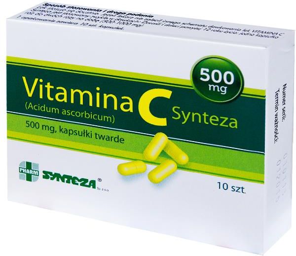 Lek Wskazania: niedobory witaminy C w organizmie lub ich zapobieganie, niedokrwistość, oparzenia; stany zapalne skóry, błon śluzowych, układu oddechowego, przewodu pokarmowego, układu nerwowego. Stany uczuleniowe, zakażenia układu moczowego, kolagenozy, rekonwalescencja, dieta uboga w witaminę C. Skład: 1 kapsułka zawiera: 500mg witaminy C oraz substancje pomocnicze: krzemionka koloidalna bezwodna, stearynian magnezu. Działanie: witamina C pełni ważną rolę w procesach oksydoredukcyjnych, wpływa na przemianę aminokwasów aromatycznych, metabolizm tyroksyny oraz syntezę katecholamin, hormonów steroidowych i insuliny. Bierze udział w procesach fosforylacji glukozy i syntezy glikogenu. W przypadkach niedoboru witaminy C dochodzi do zaburzeń syntezy kwasu hialuronowego, zaburzeń syntezy kolagenu, nieprawidłowego funkcjonowania tkanki łącznej i procesów kostnienia. Obserwuje się objawy skazy naczyniowej, wadliwe tworzenie się szkliwa zębów, zmiany w obrębie dziąseł i błon śluzowych jamy ustnej. Ułatwia wchłanianie żelaza i bierze udział w syntezie hemoglobiny. Wywiera stymulujący wpływ na procesy odpornościowe organizmu, prawdopodobnie przez wpływ na syntezę interferonu i przeciwciał. Dawkowanie: dorośli doustnie zapobiegawczo: 0,5g dziennie; leczniczo: 0,5-1g dziennie. Przeciwwskazania: wzmożone wydalanie moczanów i cystynianów.