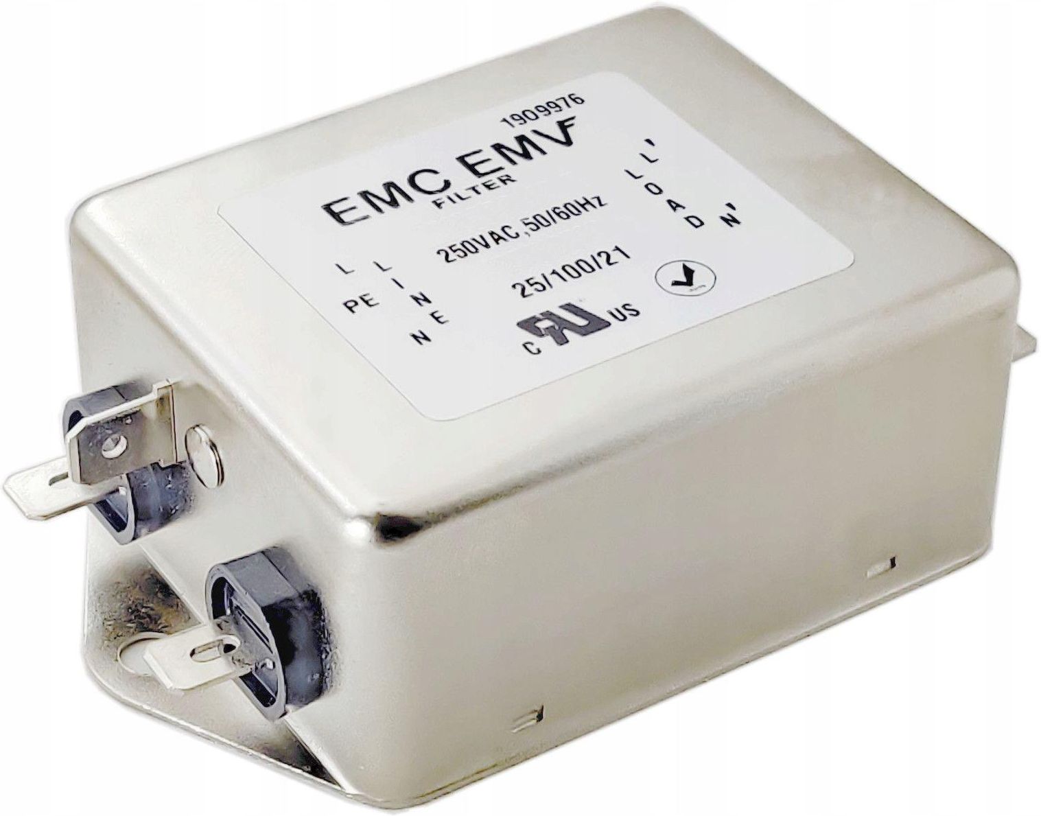 Jednofazowy filtr EMI Akyga EMC EMV EN2020-16-F 16A 120-250VAC 50/60Hz Opis Akyga EMC EMV EN2020-16-F to jednofazowy filtr EMI, zaprojektowany do tłumienia zakłóceń elektromagnetycznych w urządzeniach pracujących w sieci o napięciu 120-250VAC. Filtr zapewnia skuteczne ograniczenie zakłóceń przewodzonych, co zwiększa stabilność i niezawodność działania urządzeń elektrycznych i elektronicznych, w tym zasilaczy, przemienników częstotliwości oraz innych systemów automatyki. Produkt pracuje w szerokim zakresie częstotliwości 50/60 Hz i jest przystosowany do prądu znamionowego 16A, dzięki czemu sprawdzi się w zastosowaniach o średnim obciążeniu prądowym. Solidna konstrukcja filtra gwarantuje długą żywotność oraz niezawodne działanie w różnych środowiskach przemysłowych i komercyjnych. Właściwości Prąd znamionowy: 16A Napięcie pracy: 120-250VAC Zakres częstotliwości: 50/60Hz Typ filtra: jednofazowy EMI Zastosowanie: eliminacja zakłóceń elektromagnetycznych Temperatura pracy: -25°C do +85°C Certyfikaty: zgodność z normami EMC i EMV