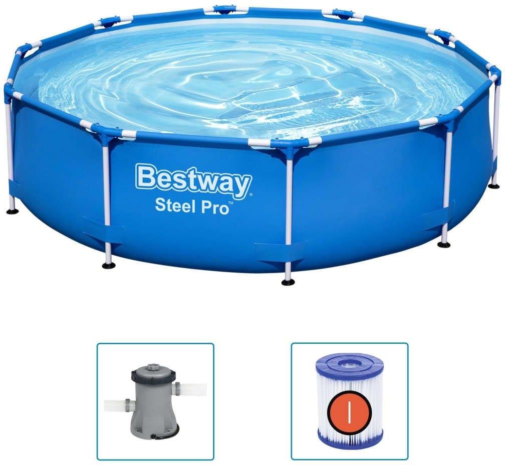 Basen Steel Pro marki Bestway zapewni Ci mnóstwo zabawy z rodziną i przyjaciółmi. Okrągły kształt oferuje więcej miejsca do pływania i zabawy. Ten stylowy basen ma wzmocnione ścianki wykonane z tworzywa Tritech - wzmocnionego, 3-warstwowego materiału, składającego się z laminowanego, mocnego tworzywa PVC oraz siatki poliestrowej. Dzięki wysokiej jakości, stalowej ramie i wzmocnionym ściankom basen naziemny jest niezwykle stabilny i trwały. Ponadto wyposażono go w system FrameLink, umożliwiający solidne i bezpieczne przyłączanie rur. Ten basen stelażowy można ustawić szybko i łatwo. Wystarczy rozłożyć go na płaskiej powierzchni, zmontować cały stelaż, a następnie wypełnić basen wodą. Zawór spustowy umożliwia szybkie i proste opróżnienie basenu z wody. Elektryczna pompa filtracyjna stanowi część systemu cyrkulacji, który utrzymuje wodę w czystości. Antymikrobowy wkład filtracyjny zapobiega rozwojowi glonów, pleśni i bakterii w basenie. Basen można łatwo złożyć do przechowywania i transportu, gdy nie jest używany. Basen: Wymiary: 305 x 76 cm (śr. x wys.) Pojemność (90%): 4678 L (1236 gal) Odporna na korozję, stalowa rama 3-warstwowe ścianki z PVC i poliestru Z 3-warstwowym pasem dla dodatkowego podtrzymania ścian System FrameLink ułatwiający bezpieczne podłączanie rur Wyściółka z nadrukiem mozaikowym na ściankach i dnie basenu Wbudowany zawór spustowy z regulacją przepływu Łatka do naprawy pod wodą Pompa filtracyjna: Wydajność pompy: 1249 L/h (330 gal USA/h) Zasilanie: 220-240 V~, 50 Hz Wymagany montaż: tak Numer artykułu Bestway: 56679 Zawartość przesyłki: 1 x basen 1 x pompa filtracyjna 1 x wkład filtracyjny przeciwko mikrobom (I)