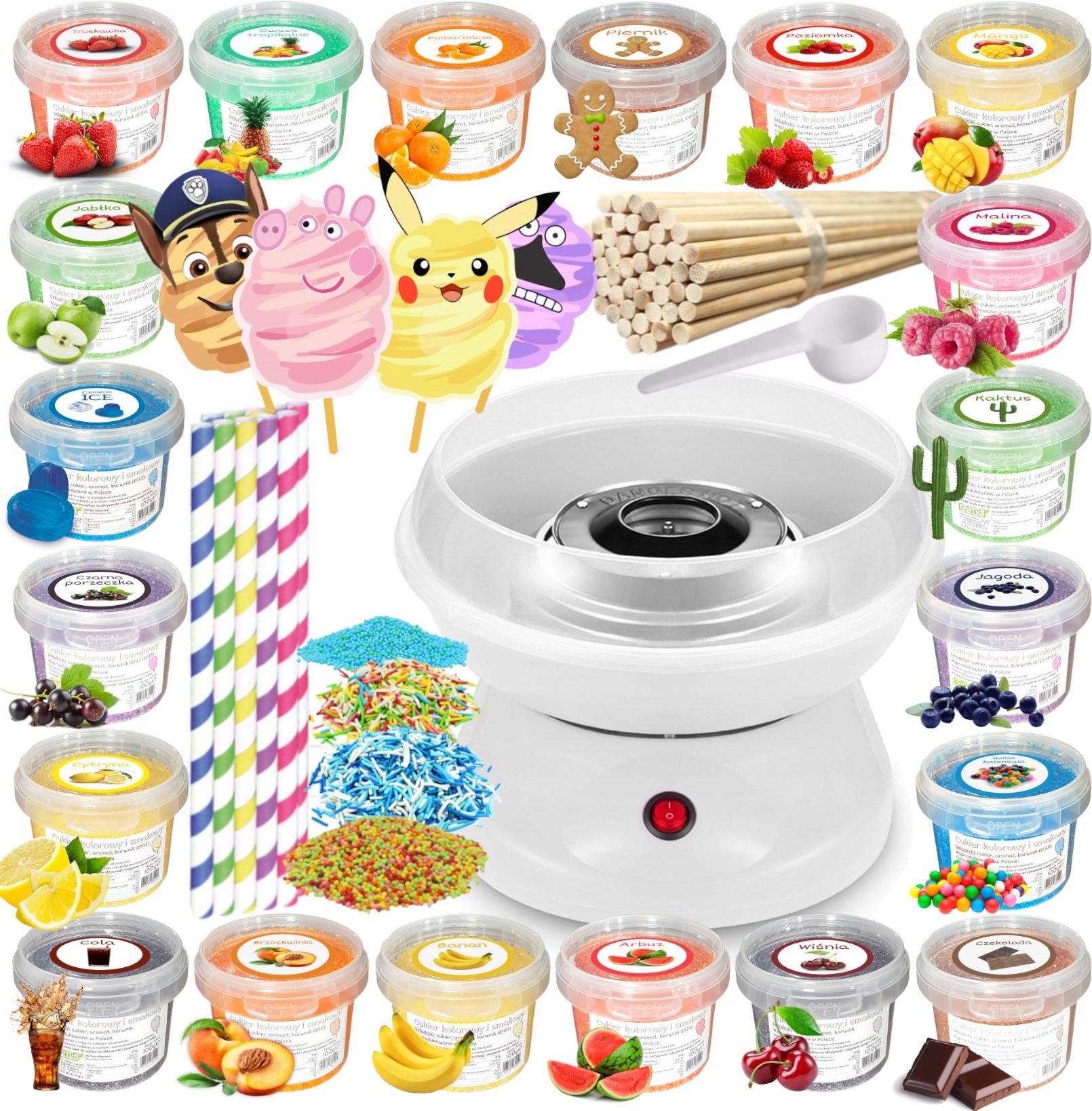 Zestaw Maszyna do Waty Cukrowej + Cukier 20x 100g Wiaderka+ Patyki+ Posypki Maszyna do Waty Cukrowej Witaj! Pragniemy przedstawić naszą ofertę - domową maszynę do waty cukrowej wraz z zestawem aż 20 cukrów w najlepszych kombinacjach kolorystycznych oraz smakowych (wraz z zapachem), zapakowanych w wiaderka (w innej ofercie dostępny zestaw z saszetkami). Do maszyny dołączone są: patyczki, miarka. Od siebie dodajemy również: 20 wiaderek cukrów 50 patyków bambusowych do kręcenia waty 30cm fi 5mm, 10 kolorowych patyczków w postaci eko-słomek 20cm, jadalne części postaci do umieszczenia na wacie 4 różne kolorowe posypki cukrowe do udekorowania watek (4x 10g: kolorowe niteczki, zimne niteczki, ciepły maczek, zimny maczek) Świetny prezent dla dzieci! Super dodatek na domowe imprezy! (W osobnych ofertach możliwość dokupienia wielu innych posypek, patyków, cukrów, dodatkowych postaci na waty i innych różności) Ta oferta dotyczy maszyny w kolorze białym, kupując wysłany zostanie właśnie taki kolor. Istnieje możliwość kupienia maszyny czerwonej, niebieskiej oraz białej, dostępne są w osobnej ofercie i tam należy dokonać zakupu. Krótka instrukcja użytkowania nakładamy misę z osłonką oraz głowicę znajdującą się na spodzie urządzenia (uwaga na dopasowanie do specjalnego wycięcia) wsypujemy cukier do głowicy (nie przepełniać) włączamy maszynę (głowica się kręci i podgrzewa) po kilku minutach cukier karmelizuje się, w tej postaci wylatuje z kręcącej się głowicy i pod wpływem chłodu powietrza robią się z niego nitki waty, które nawijamy na patyk czekamy, aż wata przestanie się pojawiać i wyłączamy maszynę smacznego! Dane techniczne maszyny Czas przygotowania waty: 3-4 minuty Średnica misy: 25 cm Moc: 450W Zasilanie: 220-240V, częstotliwość 50/60Hz Wymiary: 25 x 25 x 17 cm Waga z opakowaniem: 1,25 kg Kolor: różowy dołączona instrukcja obsługi Kilka cennych uwag: (przed zakupem prosimy o zapoznanie się z nimi) Maszynka nie jest profesjonalnym sprzętem. Jest mała i zaprojektowana z myślą o dzieciach i ich bezpieczeństwie, więc jej wydajność nie jest porównywalna np. z maszynami z festynów. Pozwala na zrobienie tylko małych watek w warunkach domowych. Wata zaczyna pojawiać się dopiero po kilku minutach w dość wolnym tempie. Podczas produkcji oprócz waty zawsze powstaje też "odpad cukierkowy". Osadza się na misie i osłonce, czasem cukierki mogą się odbić i wylecieć poza maszynę. Maszynka nie jest zaprojektowana do pracy ciągłej, po kilku zrobionych watkach warto dać jej odpocząć, a nawet wyczyścić/umyć, jeśli powstało dużo odpadu. W przeciwnym wypadku każda kolejna watka może powstawać z coraz mniejszą wydajnością. Głowiczki w tych maszynkach nie są idealnie wyważone, przez co przy ruchu obrotowym cała maszynka może delikatnie wibrować. Pod głowiczką są 2 grzałki i blaszka, jeśli cukier przypadkiem trafi na te rozgrzane elementy, może się na nich bardzo szybko spalić. Należy więc z dużą starannością wsypywać cukier tylko do głowicy przy wyłączonej maszynie. Czarny spalony cukier będący na grzałkach oraz blaszce świadczy o nieprawidłowym użytkowaniu sprzętu. Nie należy wyłączać maszynki w trakcie produkcji waty, można to zrobić dopiero, gdy przestanie się ona pojawiać, czyli głowiczka będzie pusta, bez cukru. Inaczej może on w jej wnętrzu przypalić się. Chcąc zachować czystość maszyny po jej pracy wystarczy jej zdjęte elementy (głowicę, misę, osłonę) opłukać ciepłą wodą do momentu rozpuszczenia drobinek cukru/karmelu. Uwaga na gorącą głowicę i grzałki bezpośrednio po pracy urządzenia! Zestaw cukrów (20x 100g) dołączonych do maszyny (na oddzielnych aukcjach można dokupić także inne warianty cukrów (inna waga, smaki)) Zalety naszych zestawów cukrów: najwyższa jakość potwierdzona opiniami suche i sypkie dzięki suchości nie zbrylają się, nie przyklejają do ścianek miarek, pojemników ładne, intensywne i równomierne kolory przy zachowaniu bardzo małej ilości barwników pełna gama 8 różnych kolorów wyraźnie wyczuwalny smak, a nawet zapach solidne kryształki cukru, nie cukier drobny szczelnie zamknięte w estetycznych i wysokiej jakości wiaderkach z plombami, mogących przydać się również w innych celach wyraźne etykietki ze smakami na wieczkach, ułatwiające szybkie znalezienie oraz polepszające wygląd Części postaci wydrukowane są specjalnymi tuszami spożywczymi na jadalnym papierze (opłatkowym). Wystarczy je wyciąć i umieścić na wacie we wskazany sposób, aby wata przypominała całą postać. Dzięki temu łatwo i szybko upodobnisz każdą zwykłą, nawet małą watę do postaci. W innej ofercie kupisz więcej postaci do każdego koloru waty. W zestawie dołączone są 4 różne posypki cukrowe po 10g do ozdabiania watek - niteczki oraz maczek w kolorach ciepłych i zimnych. Na innych ofertach dostępne są inne warianty posypek w większych ilościach. Dołączone 50 bambusowych patyków oraz 10 kolorowych (kolory mogą być inne) Przydatne informacje: wielkość kryształków cukrów, a także odcień kolorów mogą nieznacznie różnić się w poszczególnych dostawach lub wiaderkach. waty cukrowe zrobione z kolorowych cukrów zawsze będą jaśniejsze niż sam cukier, będą miały mniej intensywny kolor wydajność cukru kolorowego/smakowego zawsze jest trochę mniejsza niż zwykłego białego cukru, czyli z tej samej ilości cukru kolorowego/smakowego wyjdzie trochę mniejsza wata niż z cukru zwykłego podczas produkcji waty zawsze powstaje też "cukierkowy odpad" na brzegu misy, czasem cukierki odbiją się od misy i przyczepią do waty Wymienione wyżej cechy są całkowicie normalne i wynikają z praw fizyki. Szczegółowe informacje o produkcie, którego dotyczy ta aukcja: Skład cukrów: cukier (>99,44%) barwnik spożywczy (<0,06% - w cukrze czerwonym/różowy