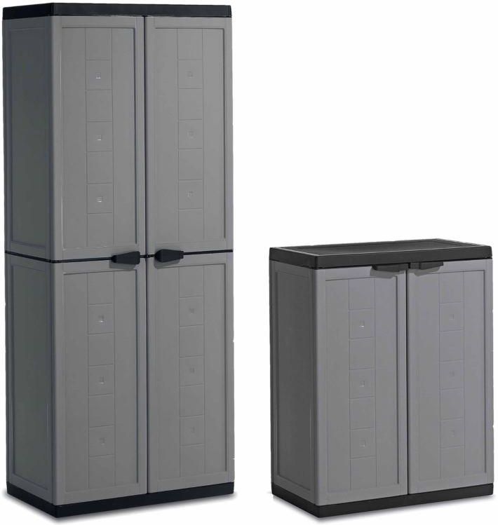 Komplet składa się z wysokiej szafy o wymiarach: 68 x 39 x 166 cm i niskiej szafy o wymiarach: 68 x 39 x 85 cm. Zestaw szafek gospodarczych JOLLY SET świetnie nadaje się do garażu, spiżarni czy pralni i pozwoli przechować wszelkie domowe akcesoria.