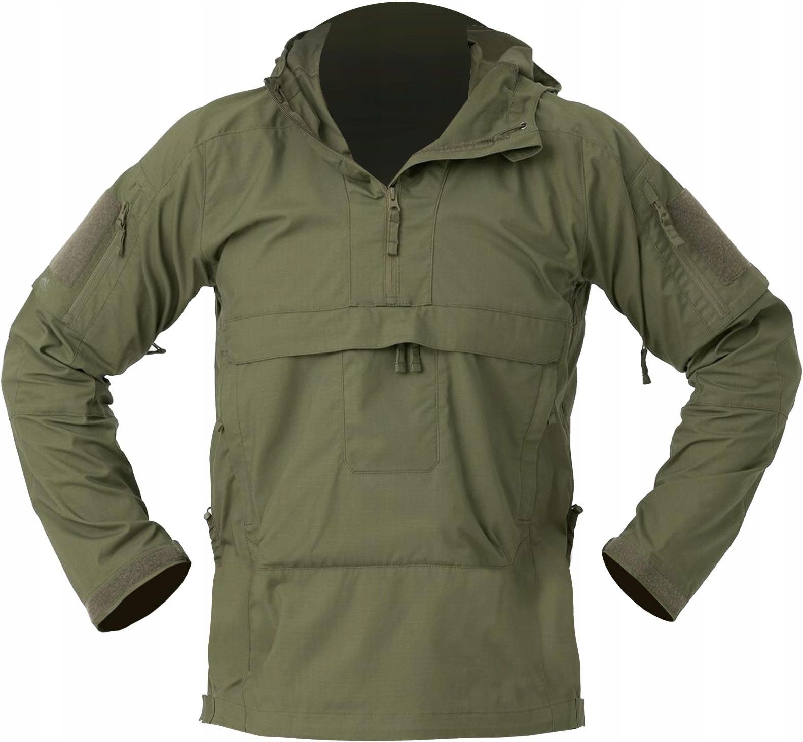 Kurtka anorak w kamuflażu Dotychczas nasze kurtki typu anorak oferowaliśmy w cywilnych barwach. Tym razem przyszła pora na ulepszoną wersję w kamuflażu. Anorak Tracer bazuje na kurtce Anorak Woodsman, ale występuje w kilku wzorach maskujących i jest lepiej przystosowany do działań taktycznych. Materiał na plecach jest taki, jak w reszcie kurtki – a nie softshellowy, tak jak w Woodsmanie. Ponadto dodaliśmy kieszenie na ramionach i z przodu, a także więcej punktów regulacji. Anorak jako kurtka wojskowa Mając na uwadze, że potrzeby cywili i żołnierzy są często inne, dostosowaliśmy naszą kurtkę pod działania militarne. Anorak Tracer w całości wykonano z jednego rodzaju materiału, bez softshella na plecach. W ten sposób cała kurtka jest pokryta takim samym kamuflażem, co poprawia zdolność maskowania. Brak softshella rekompensują zamki po bokach, które otwierają się po całości, więc można dostosować poziom wentylacji do swoich potrzeb, a anoraka po rozpięciu łatwiej ubrać. Tym samym kurtka Anorak Tracer sprawdzi się jako zamiennik dla combat shirta lub bluzy mundurowej. Obszerny, luźny krój typu oversize sprawia, że kurtka nadaje się również do noszenia na polarze lub na lekkiej kurtce (np. Wolfhound Hoodie), co sprawia, że można nosić na wierzchu potrzebny kamuflaż niezależnie od koloru ubrania pod spodem. Unisex, czyli uniwersalny Kurtka Anorak Tracer jest naszym pierwszym produktem typu unisex, co oznacza, że jego cechy nie są przypisane ani odzieży damskiej, ani męskiej. W tym przypadku chodzi o luźny krój, który nie podkreśla ani rozbudowanych ramion, ani nie podkreśla talii – jest uniwersalny, nie ogranicza wyboru. Możliwość dostosowania produktu do sylwetki zapewniają punkty regulacji, których w kurtce jest sporo: po bokach kaptura, na dole kurtki oraz w pasie. To duże ułatwienie dla użytkowników, którzy kupując produkt unisex nie muszą rozmyślać nad krojem, bo on zawsze będzie pasował. Wystarczy wybrać odpowiedni rozmiar. Rozmiarówka unisex – jak dobrać swój rozmiar? Rozmiary produktu podane w tabeli będą dotyczyć produktu, a nie pomiaru ciała i będzie to odpowiednik rozmiaru męskiego. Aby kupić produkt stosując damską rozmiarówkę wystarczy wybrać produkt o rozmiar mniejszy (np. damski M to męski S). W ten sposób każdy może znaleźć odpowiedni rozmiar dla siebie. Przemyślane kieszenie Nasz Anorak Tracer ma łącznie osiem kieszeni. Dwie zamykane kieszenie na ramionach przydadzą się podczas noszenia kamizelki zasłaniającej przednie kieszenie. Te z kolei to duża główna komora z trzema kieszonkami w środku i jedną na wierzchu. Do tej ostatniej wchodzi np. kompas, czyli to, które dobrze mieć pod ręką podczas służby. Ponadto ręce można trzymać w przelotowej kieszeni umieszczonej pod główną komorą kurtki, blisko ciała, gdzie można je ogrzać lub przechowywać np. rękawiczki. Cechy: wywietrzniki boczne rozpinane na całej długości, luźny krój typu oversize, wiele punktów regulacji, rozmiar unisex, 8 kieszeni Cechy: