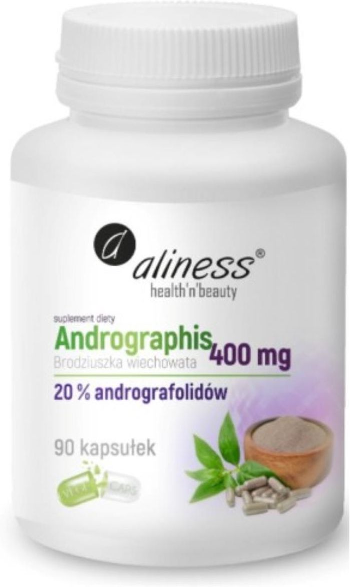 Aliness Andrographis 400 mg Brodziuszka wiechowata Suplement diety 90 kapsułek VEGE Twój sprzymierzeniec w odporności, oddechu i wątrobie: wspiera układ oddechowy wspomaga funkcjonowanie wątroby wspiera odporność działa antyoksydacyjnie Andrographis paniculata, zwana również brodziuszką wiechowatą, to wielowiekowa roślina lecznicza pochodząca z Azji Południowej. Liście i łodygi podziemne są wykorzystywane w medycynie ziołowej ze względu na bogactwo związków (m.in. andrographolidów) mających korzystny wpływ na organizm. Jej gorzki smak przyniósł jej przydomek „król gorzkich ziół”. Wsparcie układu oddechowego Brodziuszka bywa stosowana przy infekcjach górnych i dolnych dróg oddechowych Wspiera naturalną odporność układu śluzówek dróg oddechowych — ułatwia obronę przed wirusami i mikroorganizmami Wsparcie funkcji wątroby Brodziuszka wykazuje właściwości żółciopędne i osłonowe, wspomagając procesy detoksykacji i regeneracji wątroby Redukuje stres oksydacyjny i wspierając systemy antyoksydacyjne. Wsparcie odporności Pomaga organizmowi reagować skuteczniej na atak patogenów, zmniejszając ryzyko rozwój infekcji Działanie antyoksydacyjne Neutralizuje wolne rodniki, zmniejszając stres oksydacyjny, który jest czynnikiem zaangażowanym w starzenie, choroby przewlekłe i uszkodzenia tkanek Chroni komórki płuc, wątroby i innych narządów przed oksydacyjnym uszkodzeniem podczas odpowiedzi immunologicznej Składniki, 1 kapsułka, 2 kapsułki ( porcja dzienna) Ekstrakt z brodziuszki wiechowatej (Andrographis paniculata), 400 mg, 800 mg W tym andrografolidy, 80 mg, 160 mg Składniki: Ekstrakt z brodziuszki wiechowatej (Andrographis paniculata) standaryzowany na 20% andrografolidów, otoczka kapsułki: substancja wiążąca( hydroksypropylometyloceluloza). Zalecana porcja spożycia w ciągu dnia: 2 kapsułki jeden raz dziennie po posiłku, popijając wodą. Nie przekraczać zalecanej porcji do spożycia w ciągu dnia. Suplementy diety nie mogą być stosowane jako substytut (zamiennik) zróżnicowanej diety. Dla utrzymania prawidłowego stanu zdrowia należy stosować zróżnicowaną dietę i prowadzić zdrowy styl życia. Przechowywanie: przechowywać w temperaturze pokojowej, w sposób niedostępny dla małych dzieci. Chronić przed światłem Zawartość opakowania: 90 kapsułek Aliness to marka specjalistycznych suplementów diety ukierunkowanych na pielęgnację urody oraz zdrowia dla każdego i w każdym wieku. Wraz z wiekiem w naszym organizmie dochodzi do wielu zmian. Dostarczając mu odpowiednich substancji możemy wpłynąć na zahamowanie tych niekorzystnych przemian zachodzących w naszym wyglądzie oraz samopoczuciu. Eksperci marki Aliness opracowali formuły preparatów zawierające naturalne związki aktywne o wysokiej biodostępności, dzięki czemu mogą lepiej oddziaływać na dane problemy o charakterze estetycznym oraz zdrowotnym. Wszystkie informacje prezentowane na aukcji służą jedynie celom informacyjnym, nie mogą zastąpić konsultacji z lekarzem, służyć samodiagnozie lub samoleczeniu. Prezentowane produkty nie są przeznaczone do diagnozowania, leczenia ani zapobiegania żadnej chorobie. Suplementy diety nie mogą być stosowane jako substytut zróżnicowanej diety.