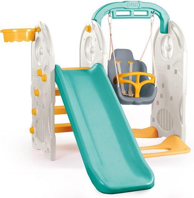 Plac zabaw 4w1 to wielofunkcyjne centrum aktywności stworzone z myślą o najmłodszych, które zapewnia nie tylko mnóstwo radości, ale także wspiera rozwój fizyczny i motoryczny dziecka. Dzięki kolorowej, przyjaznej konstrukcji, plac zabaw stanie się ulubionym miejscem zabaw każdego malucha, oferując bezpieczne i różnorodne możliwości spędzania czasu na świeżym powietrzu. Wyposażony w zjeżdżalnię o regulowanej wysokości, dostosowanej do wieku i umiejętności dziecka, gwarantuje komfort i bezpieczeństwo użytkowania. Boczne zabezpieczenia zapewniają dodatkową ochronę podczas zjeżdżania, a antypoślizgowe schodki umożliwiają łatwe i stabilne wejście na szczyt. Wbudowany kosz do koszykówki to doskonały element sportowy, który rozwija koordynację ruchową i zachęca do aktywnego trybu życia. Cała konstrukcja została wykonana z wysokiej jakości tworzywa sztucznego, odpornego na uszkodzenia i warunki atmosferyczne, co zapewnia długotrwałe i bezpieczne użytkowanie. Plac zabaw o wymiarach 123 x 156 x 170 cm i maksymalnym obciążeniu do 30 kg to idealne rozwiązanie dla dzieci w wieku przedszkolnym, które chcą łączyć zabawę z ruchem w swoim własnym, domowym parku rozrywki.