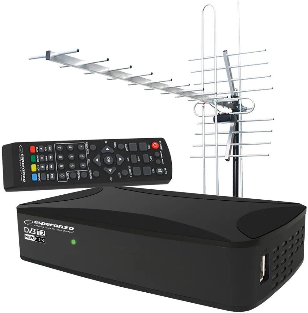 Tuner cyfrowy Esperanza EV108R DVB-T/T2 H.265/HEVC + antena kierunkowa VHF/UHF MUX8 Orneta