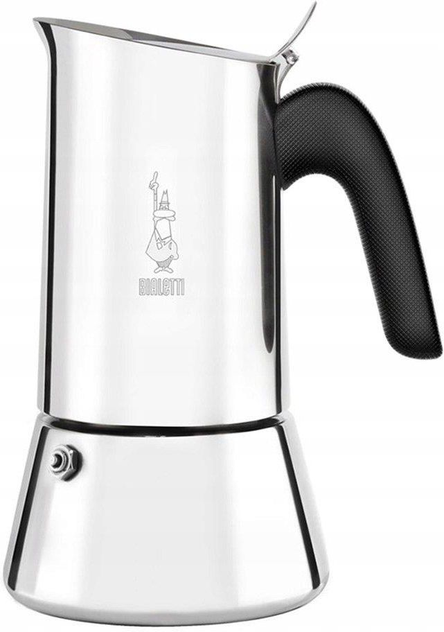 Bialetti New Venus 6tz Kawiarka Stalowa Venus to nowoczesna i jednocześnie elegancka kawiarka o smukłej formie, przypominającej dzbanek. Jej pojemność wynosi 235 ml, co pozwala na jednorazowe przygotowanie 6 filiżanek espresso po ok. 40 ml. Będzie zatem idealna dla każdej rodziny, jak i podczas spotkań z przyjaciółmi. Korpus kawiarki Venus został wykonany z wysokiej jakości stali nierdzewnej. Jest to materiał higieniczny, który nie zmienia smaku przyrządzanej kawy. Wysoki komfort użytkowania gwarantuje ergonomiczny, nienagrzewający się uchwyt z tworzywa sztucznego, umożliwiający bezpieczne przenoszenie urządzenia oraz nalewanie kawy do filiżanek. Zalety produktu Trwała i odporna na rdzę konstrukcja ze stali nierdzewnej Higieniczny, nie zmienia smaku napoju Nienagrzewająca się rączka z tworzywa sztucznego dla wysokiego komfortu użytkowania Możliwość używania na palnikach gazowych, elektrycznych, ceramicznych oraz indukcyjnych Pojemność 235 ml – na 6 filiżanek espresso po ok. 40 ml Składa się z górnego zbiornika z uszczelką, filtra oraz dolnego zbiornika Prosta i wygodna obsługa Elegancka, smukła forma przypominająca dzbanek Jak przygotować kawę w kawiarce? Urządzenie składa się z dwóch części – pojemnika górnego z uszczelką oraz zbiornika dolnego, a także filtra. Zmieloną kawę umieszczamy w filtrze, a następnie do dolnego zbiornika nalewamy wodę poniżej poziomu zaworu bezpieczeństwa. Łączymy ze sobą wszystkie elementy dokręcając kawiarkę trzymając za obie części korpusu (nie dokręcamy trzymając za rączkę). Kawiarkę kładziemy na palniku i czekamy parę minut. Dzięki powstającej parze gotującej się wody w dolnym pojemniku, pod wpływem ciśnienia woda będzie przechodzić do górnego pojemnika poprzez spoczywającą na sitku zmieloną kawę tworząc aromatyczny napar. Nasze espresso będzie gotowe w ciągu kilku minut. Ilość kaw do przyrządzenia Kawiarka Bialetti Venus 6tz umożliwi przygotowanie 6 filiżanek mocnego espresso. Producent zaleca, aby w danej wielkości (np. 6tz) zawsze przyrządzać taką ilość kawy do jakiej przeznaczona jest kawiarka. Przyjęte jest, że jedna filiżanka to ok. 40 ml naparu. We włoskiej kawiarce przyrządzimy klasyczne, mocne espresso, ale także bazę do kawy z mlekiem, cappuccino, caffe latte lub americano.