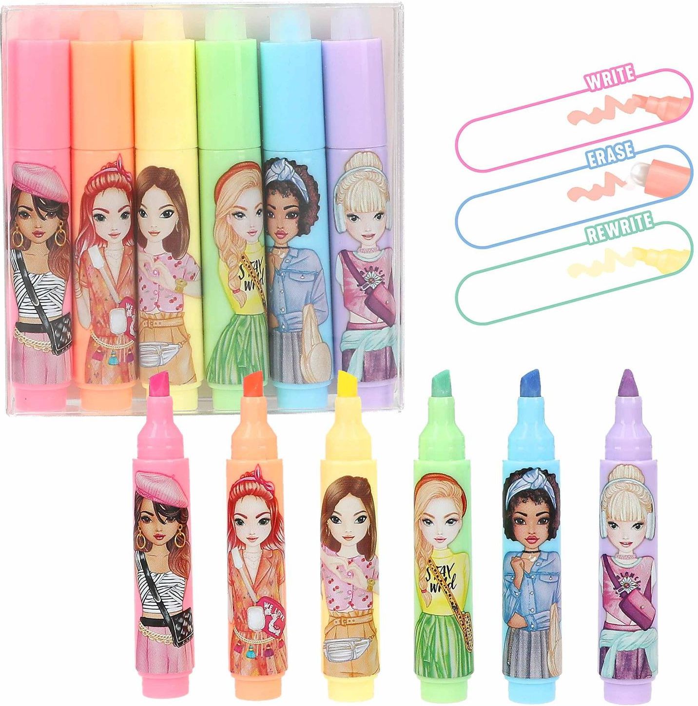Zestaw zakreślaczy ścieralnych TopModel, 6 różnych kolorów: różowy, pomarańczowy, żółty, niebieski, zielony i fioletowy, można ze sobą łączyć. Wiek: 6+.