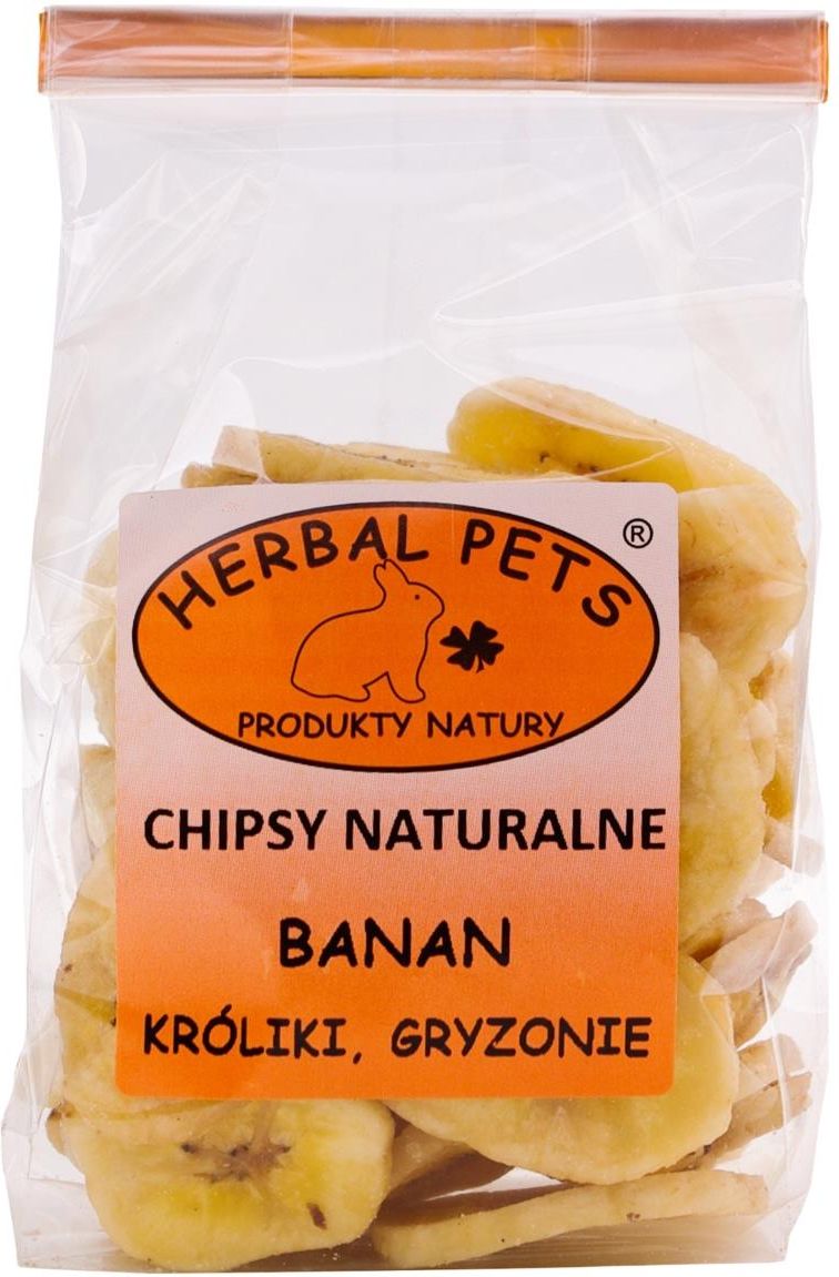 Przeznaczenie Herbal Pets chipsów z banana Naturalne, owocowe smakołyki dla gryzoni. Zalecane królikom, szynszylom, świnkom morskim, chomikom, szczurkom. ze względu na zawartość naturalnie występujących w owocach cukrów, nie polecane do podawania koszatniczkom. Charakterystyka Herbal Pets chipsów z bananów dla gryzoniBanany z którego są zrobione chipsy Hebal Pets to bardzo odżywcze owoce. Zawierają m in. potas, magnez, witaminę C i B6. Ze względu na zawartość cukru nie zaleca się ich podawania koszatniczkom. Skład chipsów Herbal Pets dla gryzoni i królikówsuszony banan Herbal Pets to polska firma o szerokiej ofercie suplementów, karm i przysmaków produkowanych w oparciu o naturalne surowce zielarskie. Ich asortyment obejmuje wiele mieszanek ziół podstawowych, ziół uzupełniających, suszonych warzyw i owoców oraz karm ziołowo-warzywnych dla królików, gryzoni, ptaków egzotycznych, psów i kotów. Receptury produktów Herbal Pets są komponowane z uwzględnieniem wymagań żywieniowych poszczególnych gatunków zwierząt domowych. Sprawdź ofertę produktów Herbal Pets w Telekarmie Dlaczego warto karmić zwierzęta pokarmami Herbal Pets► są naturalne, nie zawierają jakichkolwiek sztucznych dodatków; ► są bardzo smaczne, a stosowane profilaktycznie mogą zapobiegać wielu chorobom; ► do ich produkcji użyto tylko nisko przetworzonych surowców roślinnych, suszonych w odpowiedniej temperaturze w taki sposób, aby nie straciły swoich leczniczych i odżywczych właściwości; ► ich receptury zostały stworzone przez hodowców hobbystów oraz miłośników zwierząt na podstawie wieloletnich doświadczeń, z myślą o zdrowiu zwierząt Rola ziół w diecie gryzoni, królików i ptaków. Różnego rodzaju rośliny, w tym zioła odgrywają bardzo ważną rolę w diecie żyjących na wolności królików, gryzoni i ptaków. W naturalnych warunkach żywią się one głównie owocami, nasionami, liśćmi i korzeniami roślin, liśćmi i korą drzew. W przypadku zwierząt domowych, będących pod opieką człowieka, obowiązek dbania o prawidłową dietę ulubieńca spada na karmiącego zwierzę. To opiekun dobiera właściwą dietę dla swojego pupila, dbając tym samym o jego zdrowie, kondycję i dobre samopoczucie. Każdy królik, gryzoń i ptak poza karmą podstawową otrzymuje też dodatkowe pokarmy uzupełniające dietę – sianko, kolby, zioła, warzywa i owoce. Warto pamiętać, że to właśnie zioła mają olbrzymie znaczenie w diecie. Regulują one pracę układu trawiennego, wspierają odporność, mają też pozytywny wpływ na skórę, futro i stan upierzenia. Są naturalnym źródłem wielu witamin i składników mineralnych, dbających o zdrowie zwierzaka.