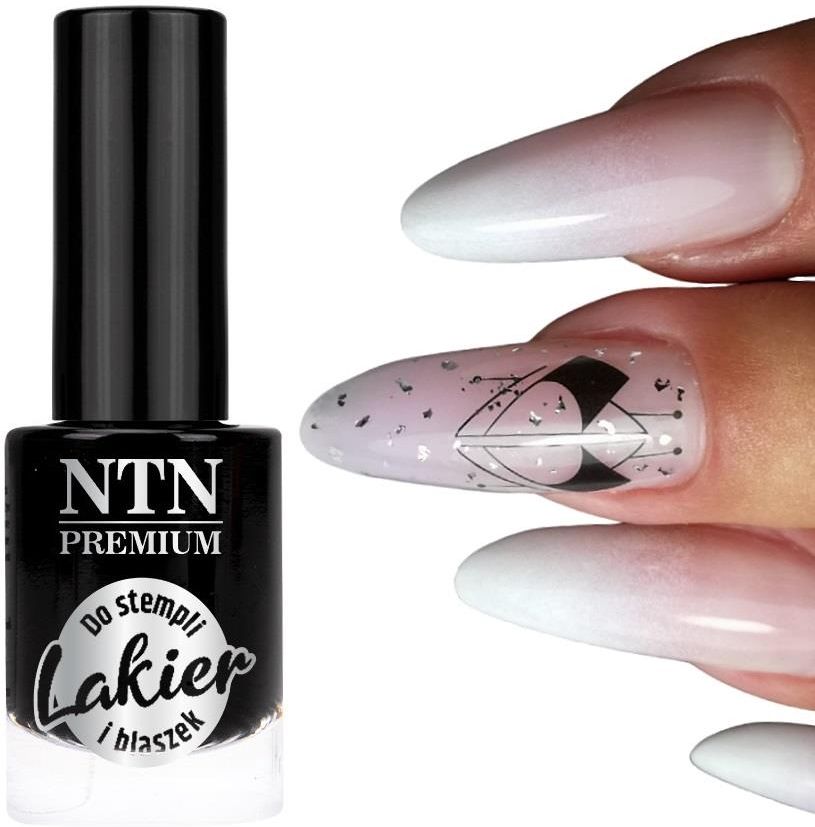 NTN Premium Lakier do stempli i blaszek CZARNY Lakier do paznokci stworzony specjalnie zmyślą o zdobieniach przy użyciu stempla. Jest bardzo gęsty co sprzyja dokładności przenoszenia i trwałości wykonywanych wzorów. Łatwość użycia i doskonały efekt wizualny jaki można uzyskać to kolejne atuty tego produktu. Sposób użycia:1. Wybrany wzór na blaszce do stempli lub płytce pokryj lakierem do stempli 2. zdrapką zetrzyj nadmiar lakieru nie dociskając zbyt mocno do powierzchni 3. Bardzo sprawnie dołóż najlepiej silikonowy stempel do płytki z wzorem i natychmiast nałóż całość na wybrany paznokcieć 4. Aby zabezpieczyć stylizację pokryj cały paznokieć bezbarwnym lakierem / topem.