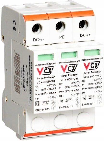 OCHRONNIK FOTOWOLTAICZNY DC C 3P 600V isk.GAZOWY VCX-40PV-C 600V klasy T2 – to zaawansowany technicznie i najwyższej jakości ochronnik przeznaczony do ochrony instalacji PV (fotowoltaicznych). Opis techniczny Klasa ochrony: T2 Wykonanie: WATYSTOROWO-ISKIERNIKOWE(MOV+GDT+MOV) Przyłącza max: 35mm2 Znamionowe napięcie pracy: Un 600V DC Prąd próbny: In(8/20) 20 kA Prąd max: Imax(8/20) 40 kA Napięciowy poziom ochrony: Up <3,5kV Temperatura składowania: -30/+70°C Temperatura otoczenia pracy: -30/+50°C Klasa szczelności: IP 20 VCX-40PV-C 600V klasy T2 – to ochronnik który jest zbudowany z wykorzystaniem specjalnego warystora (MOV) o dużym przepływie oraz iskiernika gazowego (GDT). Dlatego, użycie jednego lub dwóch warystorów może spełnić standardy, dla osiągnięcia wyników których których inni producenci potrzebują zastosować wiele warystorów. Użycie mniejszej ilości warystorów powoduje zmniejszenie wielkości ochronnika. Nasz ochronnik ma szerokość 18 mm /1 pole, a całkowita szerokość 3 biegunów wynosi tylko 54 mm. Ochronnik VCX-40PV-C 600V Specjalny warystor o dużym przepływie, Iskiernik gazowy (GDT) w module PE, Opatentowany system wyłączania; Podstawa w kształcie litery Y. Wyjątkowo precyzyjna i zaawansowana wewnętrzna struktura. Dedykowany jest do ochrony instalacji fotowoltaicznych. Wykonany w technologii warystorowo-iskiernikowej (MOV+GDT+MOV) VCX-40PV-C 1000V klasy T2 wyposażony jest w warystory (MOV) w modułach DC+ i DC– oraz iskiernik gazowy (GDT) w module PE co skutecznie eliminuje problem starzenia się iskiernika pod wpływem tzw. prądu upływu i prądu roboczego. Wyposażone są w wizualny wskaźnik działania (zielony – ochrona, czerwony – brak ochrony). VCX-40PV-C 600V klasy T2 posiada zintegrowane zabezpieczenie termiczne – nie wymaga dodatkowego dobezpieczenia termicznego (choć jest ono zawsze zalecane).