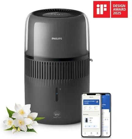 Philips HU5600/03 Czarny Nawilżacz ewaporacyjny Serii 5000 HIGIENICZNE NAWILŻANIE Z TECHNOLOGIĄ NANOCLOUD: Bezpieczniejsze i skuteczniejsze. Emituje ultra drobną mgiełkę, która uwalnia do 99% mniej bakterii niż standardowe nawilżacze. Idealna dla dzieci i osób z wrażliwymi drogami oddechowymi. BEZ BIAŁEGO OSADU I MOKRYCH PLAM: W przeciwieństwie do zwykłych nawilżaczy ultradźwiękowych, ultradrobne cząsteczki wody emitowane przez ewaporację są zbyt małe, by przenosić minerały. Dzięki temu zapewniają czystsze i bardziej komfortowe otoczenie. CIESZ SIĘ KOJĄCĄ AROMATERAPIĄ I NASTROJOWYM OŚWIETLENIEM: Stwórz relaksującą atmosferę z ulubionymi olejkami eterycznymi i delikatnym światłem. Wbudowany wskaźnik wilgotności pokazuje jej poziom w czasie rzeczywistym. HIGIENICZNA KONSERWACJA FILTRA: Zapobiega gromadzeniu się wilgoci dzięki inteligentnemu trybowi QuickDry. Wykorzystuje moc wentylatora do szybszego osuszania filtra, a czujnik wyłącza urządzenie, gdy filtr jest suchy. DO 37 GODZIN NIEPRZERWANEJ PRACY: Oddychaj komfortowo bez częstego uzupełniania zbiornika wody. Zbiornik na wodę XL 4,5L zapewnia do 37 godzin ciągłego użytkowania.