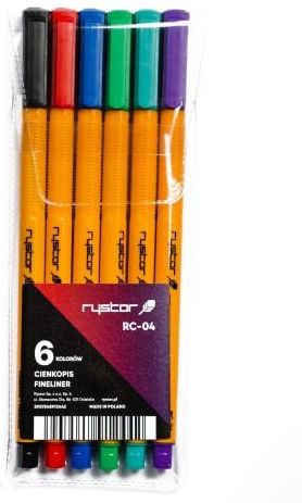 Cienkopis RYSTOR RC-04 wielokolorowy 0,4mm 6 szt. Cienkopis to precyzyjne narzędzie do rysowania i pisania cienkich, jednolitych linii za pomocą trwałej końcówki. Dzięki szybkoschnącemu, pigmentowemu tuszowi linie są intensywne, odporne na blaknięcie i wodoodporne. cienkopis to niezawodny produkt, idealny do pisania i pracy z linijką tusz na bazie wody może być pozostawiony bez zatyczki przez wiele dni- nie zaschnie zgodnie z wymogami normy ISO 554 precyzyjna fibrowa końcówka jest oprawiona w metal skuwka jest wentylowana korek w obudowie i nasadka określają kolor tuszu nasadka posiada wygodny klips możliwość poprowadzenia 1200 metrów linii pisania pod każdym kątem 360* sprawdza się w biurach, domach oraz wśród kreatywnych twórców i artystów średnica końcówki to 0,4 mm w jednym opakowaniu znajduje się 6 sztuk produktu