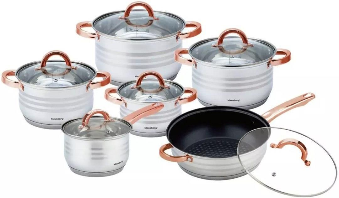 ZESTAW GARNKÓW 12 ELEMENTÓW - Wykonany z wysokiej jakości stali nierdzewnej - Wielowarstwowe dno termiczne zachowujące ciepło - Patelnia z powłoką nieprzywierającą non-stick - Żywność nagrzewa się szybko i długo podtrzymuje ciepło - Odpowiedni do wszelkich rodzajów źródeł podgrzewania: palniki gazowe, elektryczne, ceramiczne, szklane, halogenowe, indukcyjne - Uchwyty odporne na nagrzewanie w kolorze różowego złota - Atrakcyjny wygląd połączony z praktycznością - Żywność i cząstki tłuszczu nie gromadzą się przy załamaniach krawędzi - Łatwe do mycia - Bezpieczne w zmywarkach automatycznych W zestawie: - rondel z pokrywką 2,1 L Ø 16 cm x 10,5 cm - garnek z pokrywką 2,1 L Ø 16 cm x 10,5 cm - garnek z pokrywką 2,9 L Ø 18 cm x 11,5 cm - garnek z pokrywką 3,9 L Ø 20 cm x 12,5 cm - garnek z pokrywką 6,6 L Ø 24 cm x 14,5 cm - patelnia z pokrywką 3,4 L Ø 24 cm x 7,5 cm