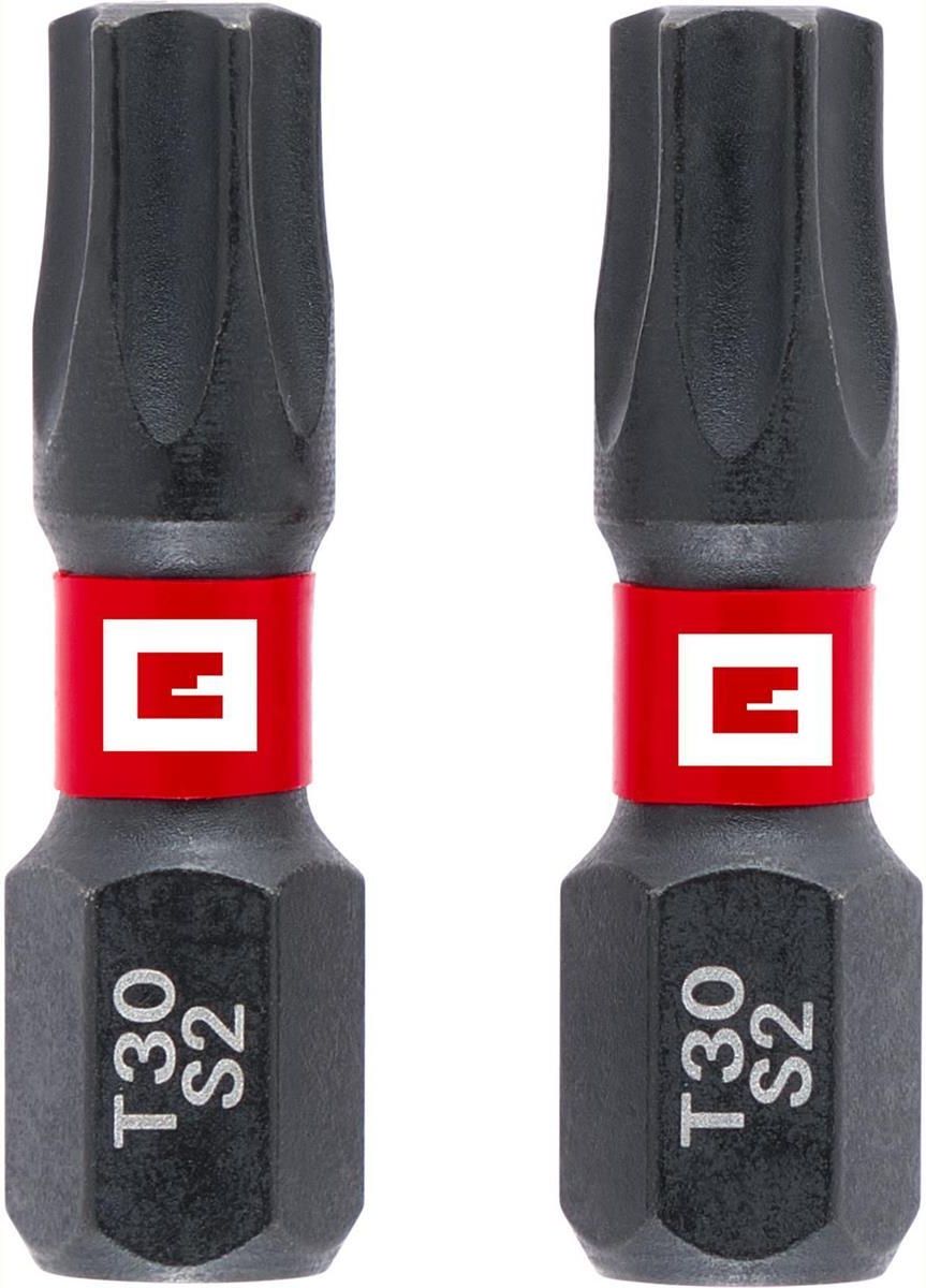 Zestaw dwóch wytrzymałych bitów podwójnie skrętnych T30 o długości 25 mm, wykonanych z wysokiej jakości stali S2, gwarantujących długą żywotność i niezawodność podczas pracy.