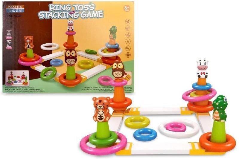 W zestawie: 4 obręcze do rzucania, elementy podstawy, paliki, 2 zestawy obręczy do piętrzenia, figurki zwierzątek montowane na paliki, funkcje: gra polega na rzucaniu obręczy tak, by trafić na wybrany palik, wym. po rozłożeniu 43 x 43 x 24 cm, wym. opak. 42 x 29 x 8 cm, 3+ Grupa wiekowa: 3+ Opakowanie: pudełko