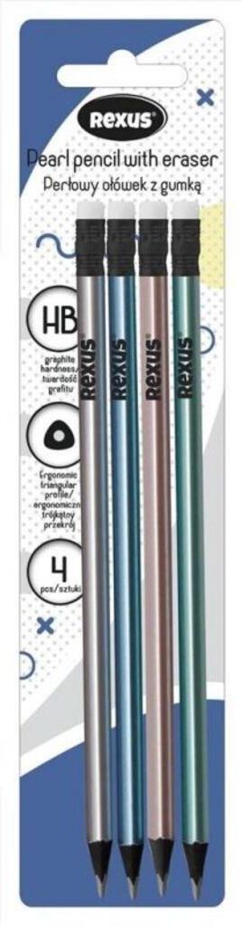 Perłowy ołówek z gumką przeznaczony jest do kreślenia, szkicowania i rysowania - zarówno na brystolu, kartonach, jak i na tekturach, czy papierach. 4 szt. na blistrze, każdy w innym kolorze, twrdość grafitu HB. Ergonomiczny trójkatny przekrój, ułatwia pewny chwyt. EAN: 5901276102021 Głębokość: …