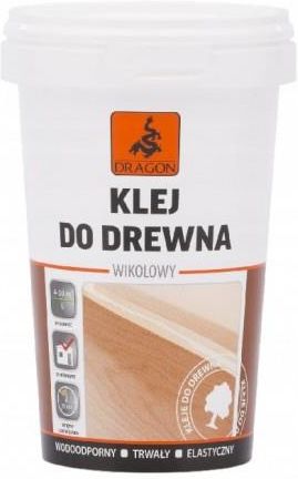 KLEJ DO DREWNA WIKOLOWY DRAGON 800ML WIKOL Model: DKDR800 Profesjonalny, wysokowydajny klej do klejenia stolarki wewnętrznej. Nie zawiera rozpuszczalników organicznych. Mieszanina dyspersji poli(octanu winylu) z dodatkiem wypełniaczy, promotorów adhezji i środków tiksotropowych. Produkt przeznaczony do bezpośredniego klejenia na zimno drewna, płyt wiórowych, sklejek, płyt stolarskich i innych materiałów drewnopochodnych między sobą oraz z wybranymi tworzywami sztucznymi i z tkaninami. Może być stosowany do klejenia papieru. Do stosowania wewnątrz pomieszczeń. Kolor kleju - biały; Kolor spoiny - bezbarwny; Konsystencja - wysokolepka ciecz; Gęstość - 1,05 kg/L; Lepkość kleju - 20000 mPas; Czas otwarty kleju - 3-10 minut; Czas wstępnego wiązania - 25 minut; Czas pełnego wiązania - 24 h; Wydajność - 4 - 10 m²/L w zależności od rodzaju i porowatości podłoża; Właściwości spoiny - wodoodporna (klasa wodoodporności D2);