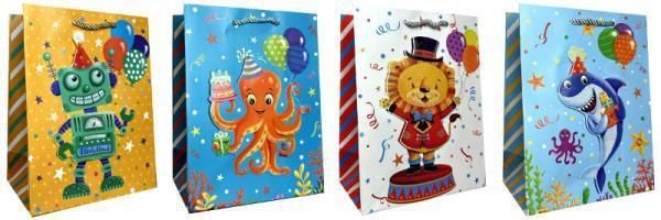 Torebka papierowa dziecięca z wizerunkiem zabawnych postaci wykonana z grubszego papieru o gramaturze 210 g, co zapewnia jej większą trwałość i odporność na obciążenie. Wyposażona w grubszy, kolorowy sznurek, który zapewnia wygodny uchwyt i estetyczne wykończenie. To praktyczne opakowanie, które podkreśla wartość wręczanego prezentu. Torebka posiada elementy brokatowe. W opakowaniu zbiorczym: 12 sztuk (mix wzorów). Rozmiar: 26X32X10 cm Szerokość dna: 10 cm Gramatura: 210g Mix wzorów, towar wysyłany losowo. Cena za sztukę. EAN: 5904703236870