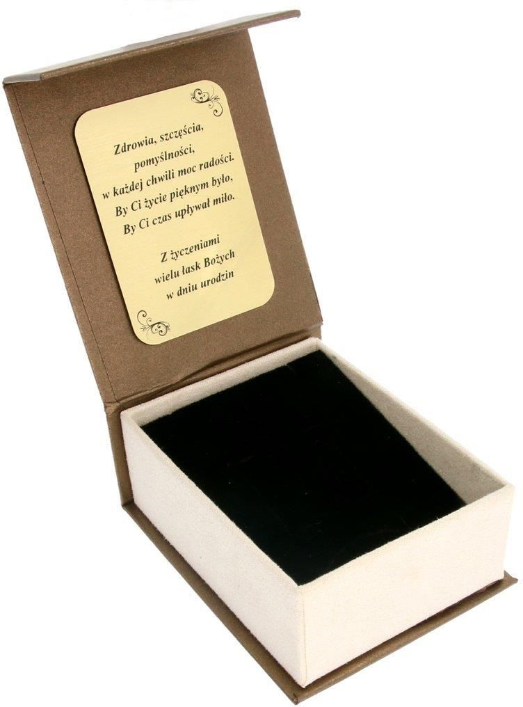 Pudełeczko tekturowe z zamknięciem na magnes o eleganckiej strukturze w kolorze brąz - ecrue. Wkładka gąbkowa dwustronna, dwukolorowa: czarna lub biała. Kolor tabliczki z laminatu do wyboru: złota lub srebrna Wymiary pudełka: Długość: ok. 85 mm Szerokość: ok. 65 mm Wysokość: ok. 33 mm