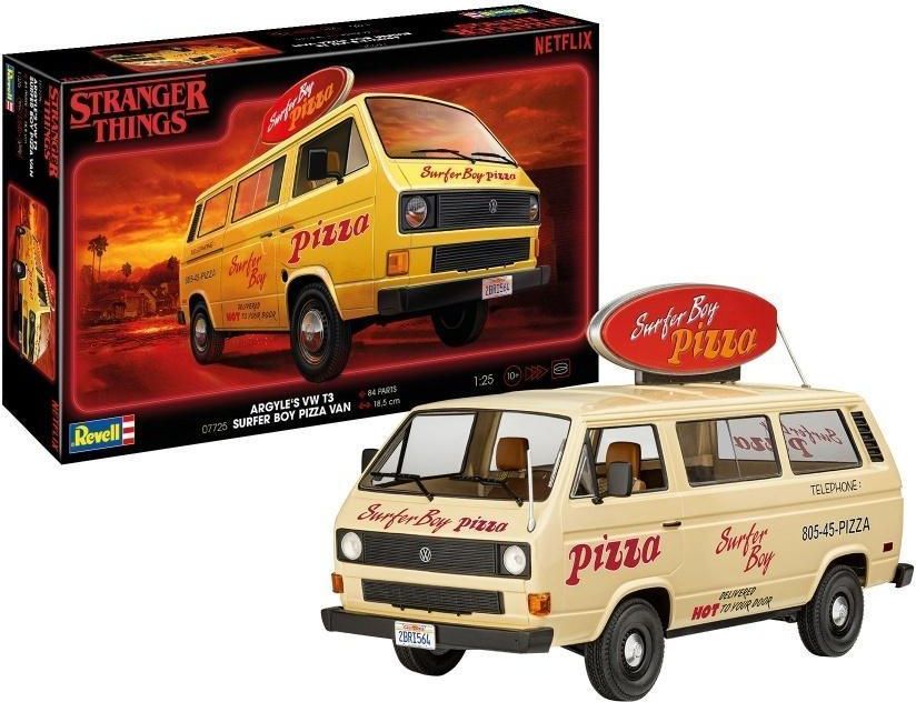 Revell 07725 Stranger Things Argyle’s VWT3 Surfer Boy Pizza V Zestawy samochodowe 1:25 1:25 „Stranger Things” Argyle'a VWT3 Surfer Boy Pizza V Wyposażony tak jak w serialu Netflix Instrukcja montażu zawierająca naklejki pasujące do danego modelu samochodu z serii „Fale są wysokie!” W czwartym …