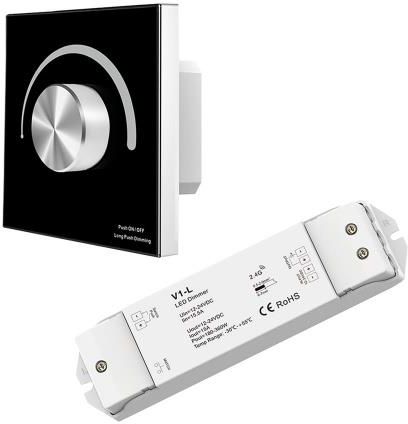 Zestaw ściemniacza LED radiowego MONO Skydance, to gotowy asortyment, składający się z panela naściennego oraz odbiornika LED, umożliwiający sterowanie monochromatycznym oświetleniem LED (np. taśma led jednokolorowa MONO). Ściemniacz ten, umożliwia indywidualny dostęp i obsługę jednej strefy, do której możemy uzyskać dostęp przy pomocy obrotowego panela naściennego. Komunikacja z odbiornikiem jest w pełni bezprzewodowa ponieważ wykorzystuje sygnał radiowy na poziomie 2,4GHz.
