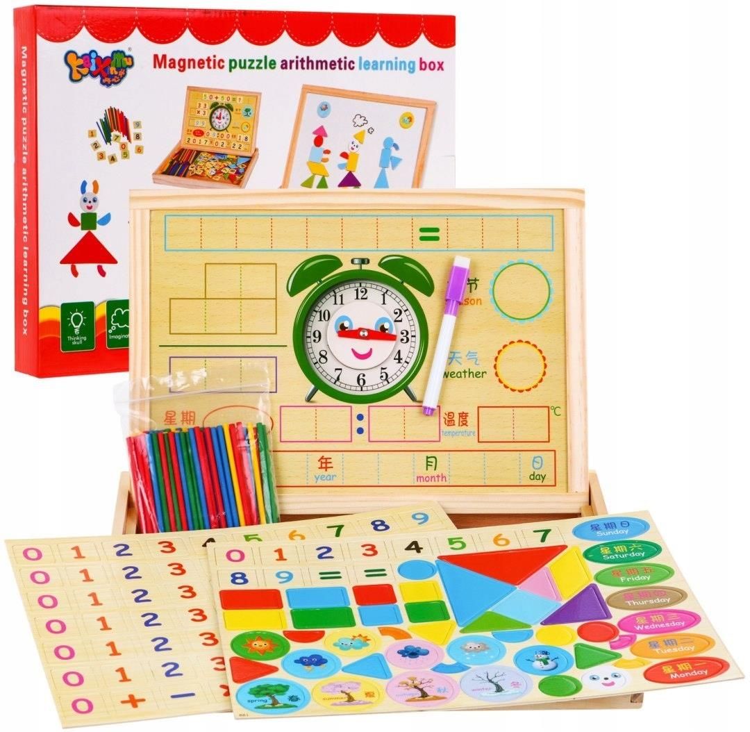 Drewniana tablica magnetyczna dla dzieci 3+ Zestaw edukacyjny RAMIZ Drewniana tablica magnetyczna dla dzieci 3+ Zestaw edukacyjny KXM-881 Magnetyczna tablica z drewna z akcesoriami do nauki to edukacyjna zabawka dla dzieci od 3-go roku życia. Bogato wyposażony, kolorowy i wytrzymały zestaw będzie pomocny dziecku przez bardzo długi czas. Z tym zestawem dziecko zaznajomi się z liczbami, dodawaniem, odejmowaniem, mnożeniem i dzieleniem, z dniami tygodnia, porami roku, figurami geometrycznymi, pogodą, zegarem oraz tabliczką mnożenia. Zestaw jest idealną pomocą w nauce oraz rozwija zdolności plastyczne. Wymiary : skrzynka ok. 34 cm x 25 cm x 3,5 cm, dwustronna tablica magnetyczna ok. 32,5 cm x 23,3 cm x 0,8 cm, kolorowe patyczki do liczenia ok. 8,5 cm długości, pisak ok. 11,5 cm długości, opakowanie ok. 35 cm x 25,8 cm x 4 cm. Zawartość zestawu : drewniana skrzynka do przechowywania akcesoriów z tabliczką mnożenia na spodzie, karty magnetyczne z liczbami, karty magnetyczne ze znakami dodawania, odejmowania, mnożenia, dzielenia, znakami większości, mniejszości, równości, pytajnikami, różnokolorowe figury magnetyczne, kółeczka magnetyczne z pogodą, porami roku, dniami tygodnia, magnetyczny zegar do nauki czasu, dwustronna tablica magnetyczna, różnokolorowe, drewniane patyczki do liczenia, instrukcja obrazkowa jak z figur ułożyć rysunek, wymazywalny pisaczek z magnesem. Zabawka przeznaczona dla dzieci powyżej trzeciego roku życia. Kod producenta: KXM-881