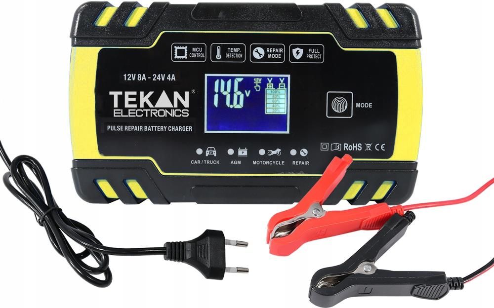 PREZENTUJEMY ABSOLUTNY NIEZBĘDNIK KAŻDEGO KIEROWCY I NIE TYLKO PROSTOWNIK AUTOMATYCZNY TEKAN ELECTRONICS Z FUNKCJĄ NAPRAWY AKUMULATORÓW 12V 8A - 24V 4A Idealnie nadaje się do akumulatorów kwasowych, żelowych oraz AGM. Ładuje akumulatory zarówno 12 jak i 24V. Automatyczny mikroprocesorowy smart prostownik pozwalający na ładowanie akumulatorów instalowanych między innymi w: samochodach osobowych, samochodach ciężarowych, motocyklach, łodziach, wózkach widłowych, kosiarkach, rowerach, zabawkach, alarmach i wielu innych. Posiada intuicyjny dotykowy ekran oraz wyświetlacz LCD, który czytelnie wyświetla parametry. Posiada funkcję automatycznego wykrywania napięcia akumulatora (12 V lub 24 V) Tryb letni i zimowy. Prostownik posiada wiele przydatnych funkcji takich jak: ochrona baterii przed uszkodzeniem; automatyczne sterowanie za pomocą mikroprocesora; automatyczne wykrywanie napięcia. Dzięki temu, że prostownik posiada bardzo kompaktowe rozmiary i jest niezwykle lekki może być łatwo przechowywany i transportowany: w samochodzie, w domu np. w szafie, na półce. Zajmuje niezwykle mało miejsca. Pasuje do większości akumulatorów. Prostownik zabezpiecza akumulator przed zwarciami, przegrzaniem, przerwami w obwodach, przeładowaniem, przetężeniem, odwrotną polaryzacją oraz iskram. Dzięki funkcji naprawy urządzenie może pomóc naprawić zużyty lub zasiarczony akumulator lub przedłużyć jego żywotność (urządzenie nie jest w stanie naprawić baterii, która jest poważnie uszkodzona, nie naładuje uszkodzonej baterii do 100%). Polska instrukcja obsługi w zestawach. WYSOKO KOMPATYBILNY - prostownik sterowany jest za pomocą mikroprocesora, który automatycznie dostosowuje prąd ładowania do napięcia. Posiada funkcję automatycznego wykrywania napięcia akumulatora (12 V lub 24 V). Doskonale współpracuje z akumulatorami wapniowymi, żelowymi, AGM oraz mokrymi, co oznacza, że może być stosowany w samochodach, motocyklach, kosiarkach, łodziach i innych pojazdach. KOMPLEKSOWA OCHRONA AKUMULATORA – ładowarka zawiera w sobie niezwykle praktyczną funkcję, jaką jest wbudowane zabezpieczenie przed zwarciami, przegrzaniem, przerwami w obwodach, przeładowaniem, przetężeniem, odwrotną polaryzacją oraz iskrami. Ponadto urządzenie ładuje akumulator automatycznie co dodatkowo chroni baterię. Dzięki tym funkcjom możesz zostawić ładowarkę podłączoną do akumulatora na czas nieokreślony. WYGODNY DOTYKOWY PANEL – prostownik posiada niezwykle praktyczny oraz intuicyjny panel sterowania. Jego obsługa przypomina obsługę telefonu komórkowego, co sprawia, że jest łatwy w użyciu. Panel składa się z pięciu przycisków. Za ich pomocą możemy włączyć ochronę, tryb naprawy, wykrywanie temperatury oraz mikro kontroler. Po prawej stronie znajduje się osobny przycisk do ładowania, który zadziała po dłuższym przyciśnięciu. KONSERWUJE / NAPRAWIA – ładowarka do akumulatorów doskonale sprawdzi się również do konserwacji baterii. Dzięki funkcji naprawy urządzenie może pomóc naprawić zużyty lub zasiarczony akumulator (urządzenie nie jest w stanie naprawić baterii, która jest poważnie uszkodzona, nie naładuje uszkodzonej baterii do 100%). SPECYFIKACJA – kolor: czarno-żółty; napięcie wejściowe: 100-240 V; moc znamionowa: 12V/8A, 24V/4A; zakres baterii: 6-150 Ah; moc: 140 W; zabezpieczenie termiczne: 65°C +/- 5°C; minimalne napięcie początkowe: 2,0V; wymiary (dł/szer/): 17/10 cm; waga: 0,70kg. JAK NAŁADOWAĆ AKUMULATOR ZA POMOCĄ PROSTOWNIKA? Podłącz CZERWONY zacisk do ładowania do zacisku + DODATNIEGO na akumulatorze. Podłącz CZARNY zacisk ładowania do podwozia pojazdu, bloku silnika lub zacisku - MINUSOWEGO na akumulatorze. Nie mocuj zacisków do gaźnika, przewodów paliwowych, lakierowanych lub blaszanych części karoserii. Włóż wtyczkę do gniazdka elektrycznego i włącz prostownik. PASUJE DO WIĘKSZOŚCI AKUMULATORÓW Dzięki temu, że prostownik posiada funkcję automatycznego ładowania oraz 3-stopniowy tryb pracy będzie doskonale współgrał z większością akumulatorów dostępnych na rynku. NAPRAWA I KONSERWACJA Dzięki funkcji naprawy urządzenie może pomóc naprawić zużyty lub zasiarczony akumulator lub przedłużyć jego żywotność (urządzenie nie jest w stanie naprawić baterii, która jest poważnie uszkodzona, nie naładuje uszkodzonej baterii do 100%). DOTYKOWY PANEL Ładowarka posiada niezwykle praktyczny oraz intuicyjny panel sterowania. Jego obsługa przypomina obsługę telefonu komórkowego, co sprawia, że jest łatwy w użyciu. LEKKOŚĆ ORAZ KOMPAKTOWY ROZMIAR Dzięki temu, że prostownik jest lekki i posiada niewielkie wymiary jest łatwy w przechowywaniu zarówno w samochodzie jak i w domu.