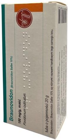 Braunovidon 100 mg/g maść 20 g to preparat do stosowania miejscowego na skórę, który zawiera powidon jodowany o działaniu odkażającym. Braunovidon maść stosowana jest m.in. w przypadku oparzeń spowodowanych ogniem lub gorącymi płynami, a także przy zakażonych owrzodzeniach, odleżynach oraz powierzchownych ubytkach skóry, którym towarzyszy stan zapalny. Preparat może być również pomocny przy ropnych zmianach skórnych, wywołanych przez bakterie lub grzyby. Lek nakłada się bezpośrednio na zmienione chorobowo miejsce kilka razy dziennie. Braunovidon 100 mg/g maść 20 g należy stosować wyłącznie na zlecenie lekarza.