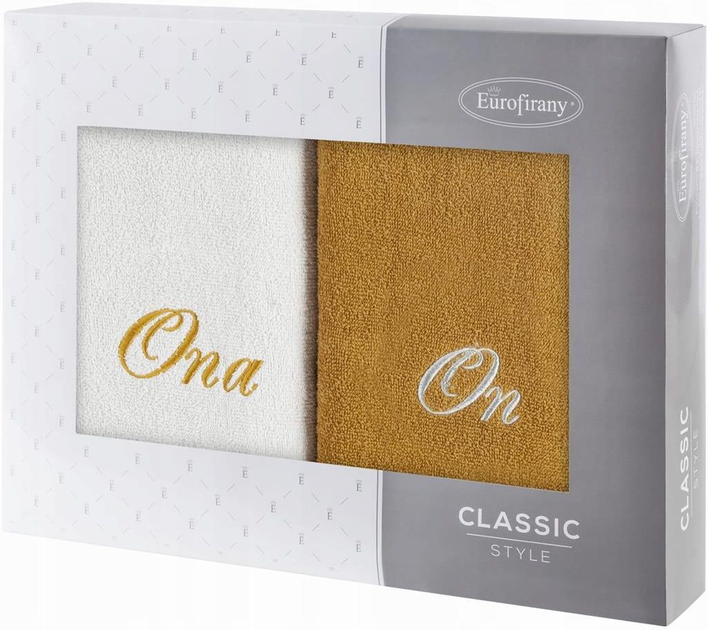 Komplet ręczników ON i ONA – wyjątkowy duet dla dwojga Komplet ręczników ON i ONA marki Eurofirany to elegancki zestaw dla par, który łączy praktyczność z indywidualnym stylem. Dwa ręczniki o wymiarach 70 × 140 cm – wykonane są z miękkiej bawełny frotte o gramaturze 400 GSM. Ręczniki w kolorze srebrnym i musztardowym zostały udekorowane modnym haftem „ON” i „ONA”, co sprawia, że każdy komplet to nie tylko tekstylia, ale i osobisty, designerski akcent Kolory i haft – styl i spójność Połączenie wyważonego srebra z wyrazistą musztardą tworzy nowoczesne zestawienie kolorystyczne – idealne do różnorodnych wnętrz łazienkowych, od minimalistycznych po glamour. Haftowane napisy są subtelne, ale wyraźnie podkreślają, dla kogo jest który ręcznik – intymny, osobisty detal, który doceni każda para . Wymiary użytkowe Dwa ręczniki o identycznym rozmiarze 70 × 140 cm zapewniają wygodę i komfort – idealne po kąpieli, nawet w sypialni czy spa. Jest to wersja kąpielowa, która zaspokoi potrzeby zarówno męskie, jak i damskie. Materiał i gramatura – gwarancja jakości Ręczniki powstały w 100 % z naturalnej bawełny frotte, co zapewnia miękkość i wysoką chłonność. Gramatura 400 GSM to optymalna równowaga między szybkim schnięciem a trwałością – potwierdzona licznymi opiniami i specyfikacją allegro.pl+9allegro.pl+9brw.pl+9allegro.pl. Opakowanie i prezentowe przeznaczenie Zestaw jest zapakowany w estetyczne kartonowe pudełko – gotowy do wręczenia jako prezent bez dodatkowych opakowań. Idealny wybór na ślub, rocznicę, walentynki czy imprezę domową Kluczowe zalety dwa ręczniki kąpielowe 70×140 cm – komfort i wygoda dla par haftowane „ON” i „ONA” – osobisty, stylowy element kolory srebrny + musztardowy – modne, trwałe, uniwersalne 100 % bawełna, 400 GSM – przyjemna miękkość i chłonność gotowy prezent – idealny na wiele okazji Opieka i pielęgnacja Aby ręczniki zachowały jakość na dłużej: • prać w temp. do 40 °C (najpierw osobno), • unikać chloru i silnych detergentów, • suszyć w suszarce bębnowej i prasować (≤110–150 °C) Dlaczego warto? Ten komplet to nie tylko funkcjonalne elementy łazienki — to przemyślany gadżet dla dwojga. Ręczniki sprawdzą się doskonale w łazienkach typu hotelowego czy gościnnych, ale także w domach, gdzie liczy się komfort i estetyka. Dzięki subtelnemu haftowi zestaw wyróżnia się na tle masowych tekstyliów, a kontrastujące kolory dodają charakteru.