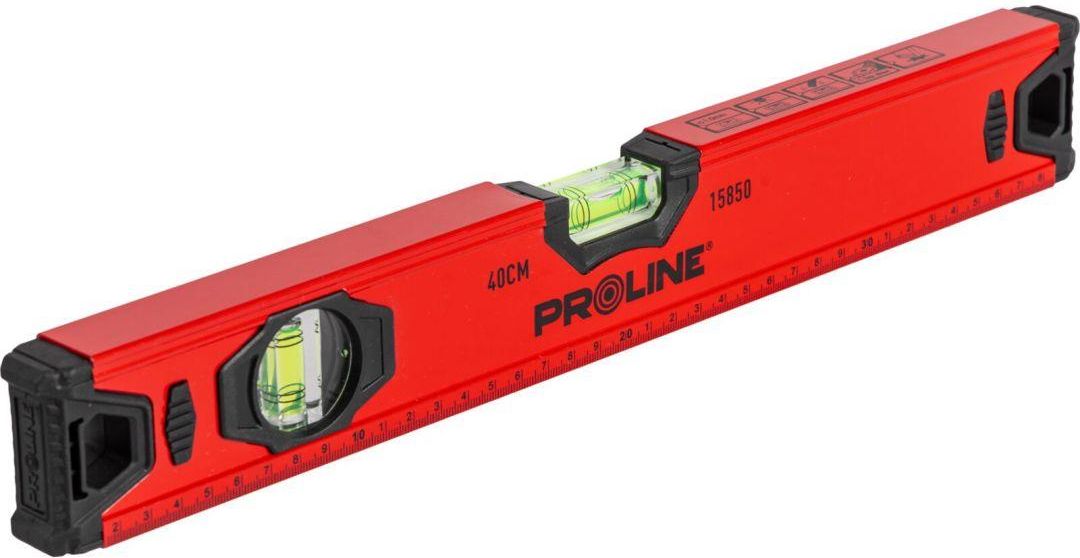Poziomnica aluminiowa 40cm 0,4m 2 libelki 1mm/1m STANDARD Proline 15850 Poziomnica Proline 15850 z serii STANDARD to narzędzie, wykonane z wysokiej jakości aluminium, które zapewnia trwałość i precyzję pomiaru. Dzięki zastosowaniu prostokątnego profilu aluminiowego z dodatkowymi przetłoczeniami, poziomnica cechuje się wytrzymałością oraz ergonomicznym, pewnym chwytem. Kluczowe cechy produktu Długość: 40 cm – kompaktowy rozmiar idealny do prac w trudno dostępnych miejscach. 2 libelki (0°/90°) – zapewniające precyzyjny pomiar z dokładnością 1mm/1m. Frezowana dolna powierzchnia – dla idealnego kontaktu z podłożem, gwarantująca najwyższą dokładność pracy. Specjalne nasadki z tworzywa TPR – pochłaniające uderzenia przy upadku, chronią poziomnicę przed uszkodzeniami. Nadrukowana miara – ułatwia szybkie i precyzyjne zaznaczanie odległości. Malowanie proszkowe – zabezpiecza korpus przed korozją i zwiększa jego trwałość. Zastosowanie Poziomnica Proline 15850 40 cm to idealne narzędzie dla profesjonalistów i majsterkowiczów, którzy potrzebują precyzji w codziennych pracach budowlanych, wykończeniowych oraz montażowych. Świetnie sprawdzi się przy instalacjach, pracach stolarskich czy montażu płytek. Dlaczego warto wybrać poziomnicę Proline? Wytrzymała konstrukcja – aluminiowy korpus i specjalne nasadki chronią narzędzie przed uszkodzeniem. Wysoka precyzja – dwie libelki gwarantują dokładne pomiary zarówno poziome, jak i pionowe. Kompaktowy rozmiar – idealny do pracy w trudno dostępnych miejscach. Nadruk miary – oszczędza czas, umożliwiając szybkie zaznaczenie punktów pomiarowych.