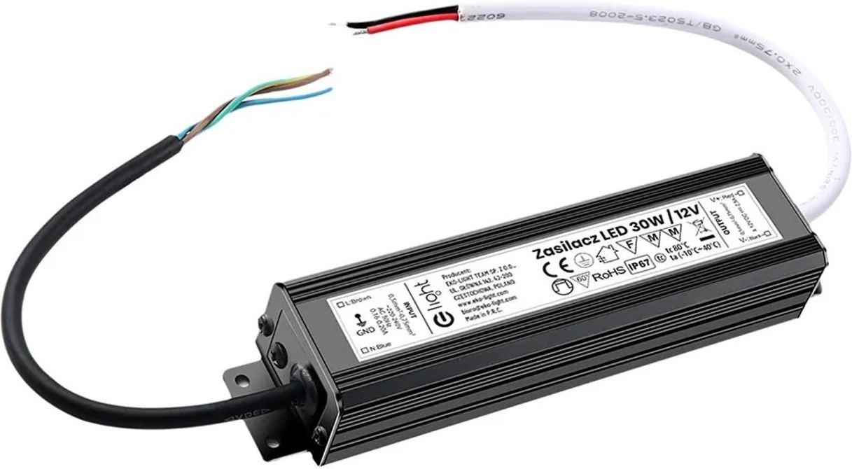 Zasilacz LED 12V/2,5A 30W IP67 Zasilacz zewnętrzny modułowy marki EKO-LIGHT model EKZAS9702 o mocy 30 W w obudowie metalowej o zminiaturyzowanej konstrukcji, która umożliwia prawidłowe chłodzenie oraz zabezpieczenie przed porażeniem. Zasilacz posiada stopień ochrony IP67. Przeznaczony jest do zasilania taśm LED, modułów, paneli, listew, żarówek LED oraz wielu innych urządzeń elektronicznych zasilanych napięciem stałym 12V DC. Specyfikacja produktu: - Zasilacze modułowe przeznaczone są do stosowania w domowych instalacjach oświetlenia LED. Maksymalna moc wynosi aż 30W. Napięcie wyjściowe 12V DC. - Modułowa konstrukcja umożliwia łatwy i wygodny montaż do powierzchni poziomych jak i pionowych wewnątrz pomieszczeń. Montaż: wystające przewody wystarczy zgodnie z instrukcją obsługi połączyć z jednej strony do źródła LED a z drugiej do zasilania, do łączenia przewodów zaleca się użycia kostek elektrycznych, montażu powinna dokonywać osoba z uprawnieniami elektrycznymi. - Wbudowane zabezpieczenia - stabilizator napięcia - gwarantują nieprzerwaną pracę wszystkich podłączonych elementów LED. - Napięcie zasilające 100-240V AC. - Szerokie zastosowanie do wszystkich urządzeń potrzebujących prądu stałego 12V. Dane techniczne: Maksymalna moc: 30W Napięcie wyjściowe: 12V Natężenie wyjściowe: 2,5A Stopień ochrony: IP67 Zastosowanie: zewnętrzne Rodzaj: standard Wymiary: 202 x 34 x 23 mm Przykładowe zastosowanie: Jeśli moc zasilacza wynosi 60W w przypadku zasilenia taśmy LED zaleca się podłączenie odcinka, którego moc nie przekracza 50W czyli np. 5m taśmy LED o mocy 10W z metra . Zasilacze napięciowe charakteryzują się obudową o wysokiej klasie szczelności IP67, co pozwala na użytkowanie w warunkach podwyższonej wilgotność, takich jak łazienki, pralnie itp. Zasilacze zapewniają stałe napięcie wyjściowe niezależnie od obciążenia. Przeznaczone są do zasilania szerokiej gamy urządzeń w tym oświetleniowych i dekoracyjnych systemów LED m.in. pojedynczych diod, listew, modułów, paneli, żarówek halogenowych LED itp. Stopień ochrony IP67 - WODOSZCZELNY! przeznaczone są do stosowania w domowych instalacjach oświetlenia LED oraz do pomieszczeń o podwyższonej wilgotności! Modułowa konstrukcja umożliwia łatwy i wygodny montaż do powierzchni poziomych jak i pionowych wewnątrz pomieszczeń. Urządzenie charakteryzuje duża żywotność i wysokiej jakości materiały wykonania.