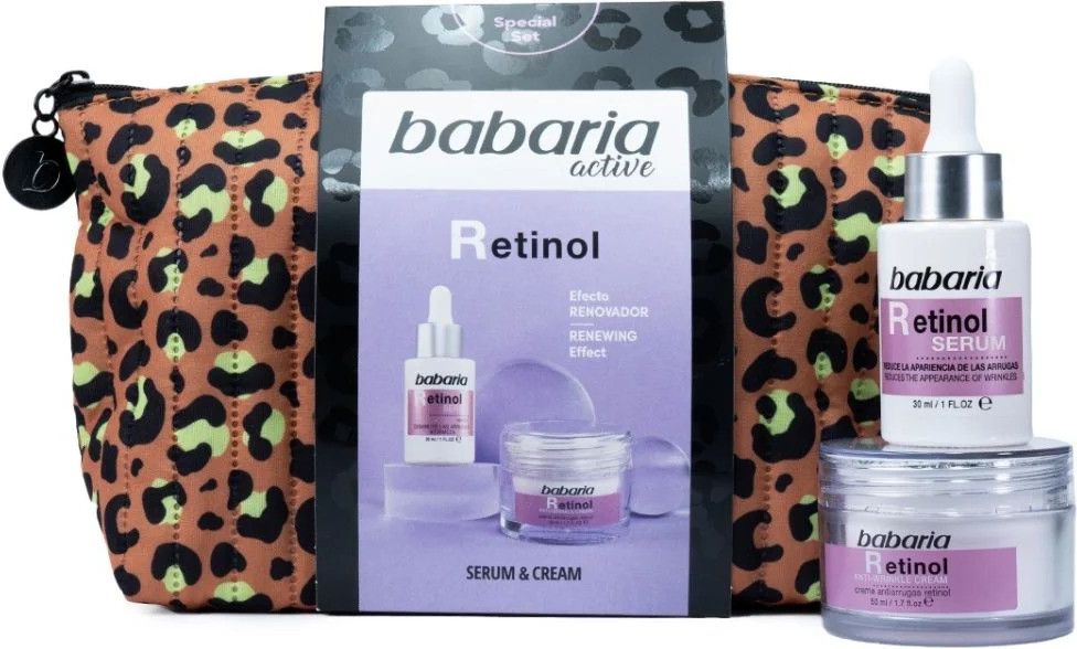 Babaria zestaw kosmetyków dla niejSerum 30 ml + Krem 50 ml.Łączy serum i krem do twarzy z retinolem, aby odnowić skórę, redukując zmarszczki i niedoskonałości. Wspomaga syntezę nowego kolagenu i elastyny, zapewniając skórze jędrniejszy, bardziej elastyczny i młodszy wygląd.