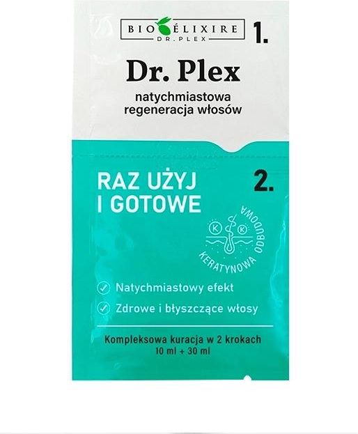 Bioelixire Dr. Plex – natychmiastowa regeneracja włosów (saszetka 10 ml + 30 ml) Twoje włosy są matowe, szorstkie i pozbawione życia? Dwufazowa kuracja Bioelixire Dr. Plex to ekspresowe rozwiązanie, które już po jednym zastosowaniu przywraca pasmom zdrowy wygląd, gładkość i blask. Efekt profesjonalnego zabiegu fryzjerskiego w zaledwie 15 minut! Jak działa Dr. Plex? Faza 1 – Plex: skoncentrowana formuła z hydrolizowaną keratyną odbudowuje włosy od wewnątrz, uzupełnia ubytki, wygładza i przygotowuje kosmyki na dalszą regenerację. Faza 2 – Odżywka: intensywnie nawilża i wzmacnia dzięki keratynie, pantenolowi i glicerynie. Nadaje włosom sprężystość, miękkość i jedwabistą gładkość. Efekty stosowania odbudowa struktury włosów i wyrównanie porowatości, intensywne nawilżenie i ochrona przed puszeniem, większa sprężystość i odporność na uszkodzenia, włosy pełne blasku, jedwabiste i gładkie w dotyku, widoczny efekt już po pierwszym użyciu. Idealne rozwiązanie po zabiegach chemicznych i stylizacji na gorąco, po ekspozycji na słońce i niesprzyjające warunki pogodowe, przed ważnym wyjściem, zawsze, gdy włosy potrzebują szybkiej regeneracji. Sposób użycia Zawartość saszetki nr 1 (Plex) wymieszaj z 30 ml wody i nałóż równomiernie na włosy. Pozostaw na min. 5 minut. Bez spłukiwania, nałóż saszetkę nr 2 (Odżywka). Dla lepszego efektu delikatnie rozczesz włosy. Odczekaj 10 minut, następnie spłucz letnią wodą i umyj włosy łagodnym szamponem. Dlaczego warto? dwufazowa kuracja – odbudowa i nawilżenie w jednym, wysokie stężenie składników aktywnych (keratyna, pantenol, gliceryna), efekt widoczny już po 1 użyciu, kompaktowe opakowanie – idealne w podróży i na co dzień, odpowiedni dla każdego rodzaju włosów. Pojemność: 10 ml + 30 ml (saszetka jednorazowa).