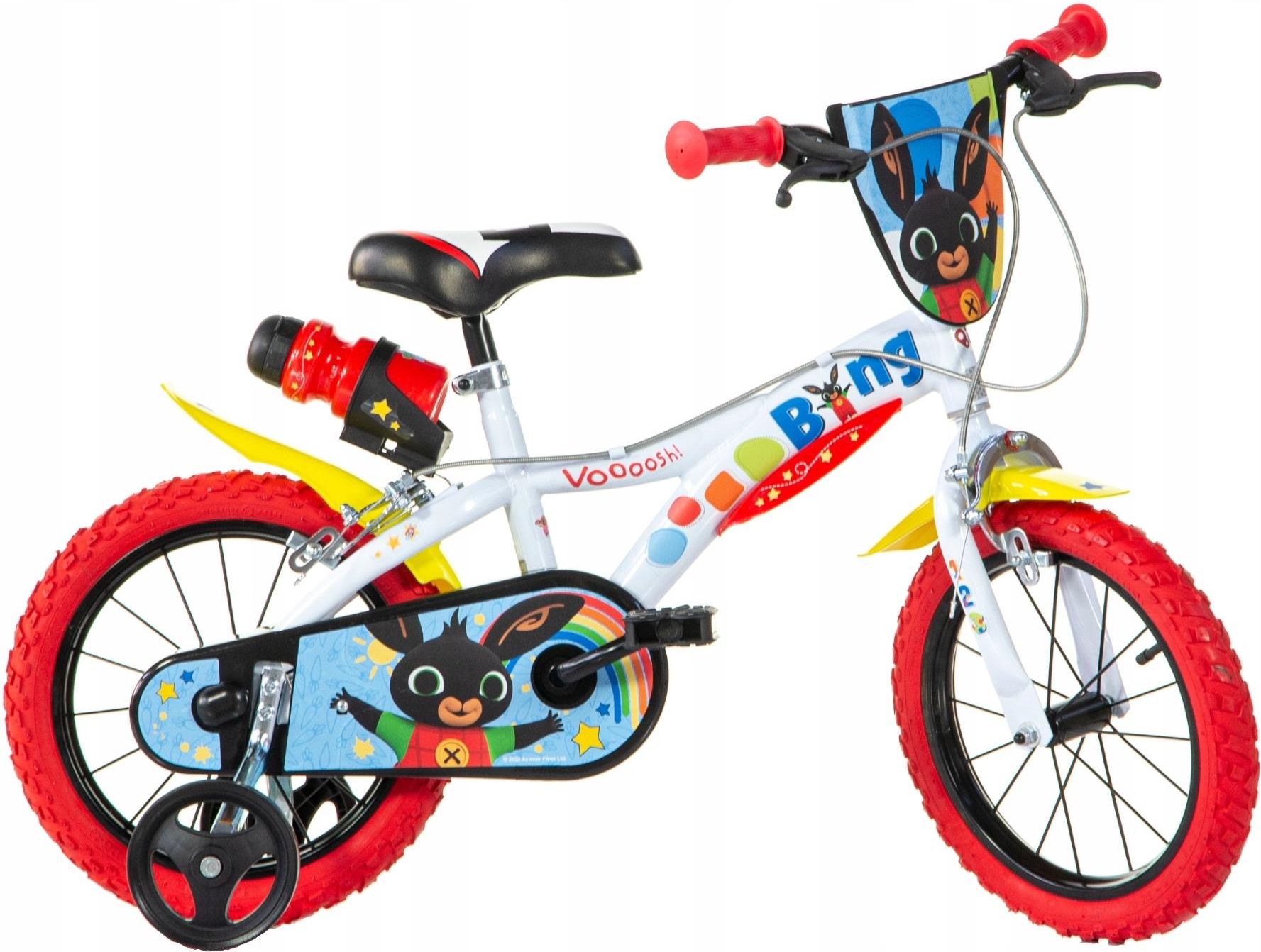 Rower dziecięcy DINO BING, 14 cali [Biały, Rama dziecięca] Idealny wybór na pierwszy rowerek dla dziecka Wykonany z solidnej i lekkiej stali, ten rowerek zapewnia stabilność i bezpieczeństwo podczas jazdy, co jest niezwykle istotne dla początkujących rowerzystów. Antypoślizgowe chwyty na kierownicy oraz miękkie gąbkowe siodełko gwarantują wygodę nawet podczas dłuższych przejażdżek, co pozwala dziecku skupić się na odkrywaniu nowych miejsc i przyjemności z jazdy, czy też nauce jazdy na rowerze. Zaprojektowany z myślą o dzieciach Rower został zaprojektowany z myślą o małych odkrywcach w wieku od 4 lat, oferując im nie tylko bezpieczną, lecz także inspirującą formę transportu. Kolor biały nadaje rowerowi świeżości i lekkości, co sprawia, że jest on nie tylko praktycznym środkiem transportu, ale także atrakcyjnym elementem wyposażenia dla każdego malucha. Bajkowy świat i włoski producent Rowerek dziecięcy BING to nie tylko bajkowy przyjaciel, ale także dumny przedstawiciel włoskiej inżynierii i designu. Produkowany we Włoszech przez Dino Bikes, łączy w sobie precyzję wykonania z eleganckim stylem. Z pewnością spełni oczekiwania miłośników wysokiej jakości produktów, oferując nie tylko doskonałe osiągi, ale również wyjątkowy charakter pochodzący z serca włoskiej produkcji. Nauka jazdy na rowerze z rowerkiem dziecięcym BING Rowerek dziecięcy BING 14" to niezwykle uroczy i funkcjonalny rowerek, który nie tylko zachwyca swoim wyglądem, ale także oferuje wiele możliwości zabawy i nauki dla najmłodszych rowerzystów i rowerzystek. Inspiracja z popularnej bajki BING nadaje mu wyjątkowego charakteru, który przyciąga uwagę dzieci i rodziców. Został kompleksowo wyposażony. Jak to wygląda? Błotniki, bidon na picie, osłona łańcucha oraz kierownicy, a także kółka boczne do nauki jazdy. Taki rowerek po prostu spełni marzenia dziecka o nauczeniu się jazdy na rowerze! Wyposażony z troską o najmłodszych dzieciach Koła o średnicy 14 cali, wyposażone w pompowane opony, zapewniają płynną jazdę nawet po nierównych nawierzchniach. Stalowe piasty gwarantują trwałość i odporność na intensywne użytkowanie, co sprawia, że ten rowerek będzie towarzyszył dziecku przez wiele sezonów, rosnąc razem z jego umiejętnościami. Z kolei motywy z bajki BING dodają mu dodatkowego uroku i sprawiają, że staje się on ulubionym rowerkiem każdego małego fanatyka tej kreskówki.