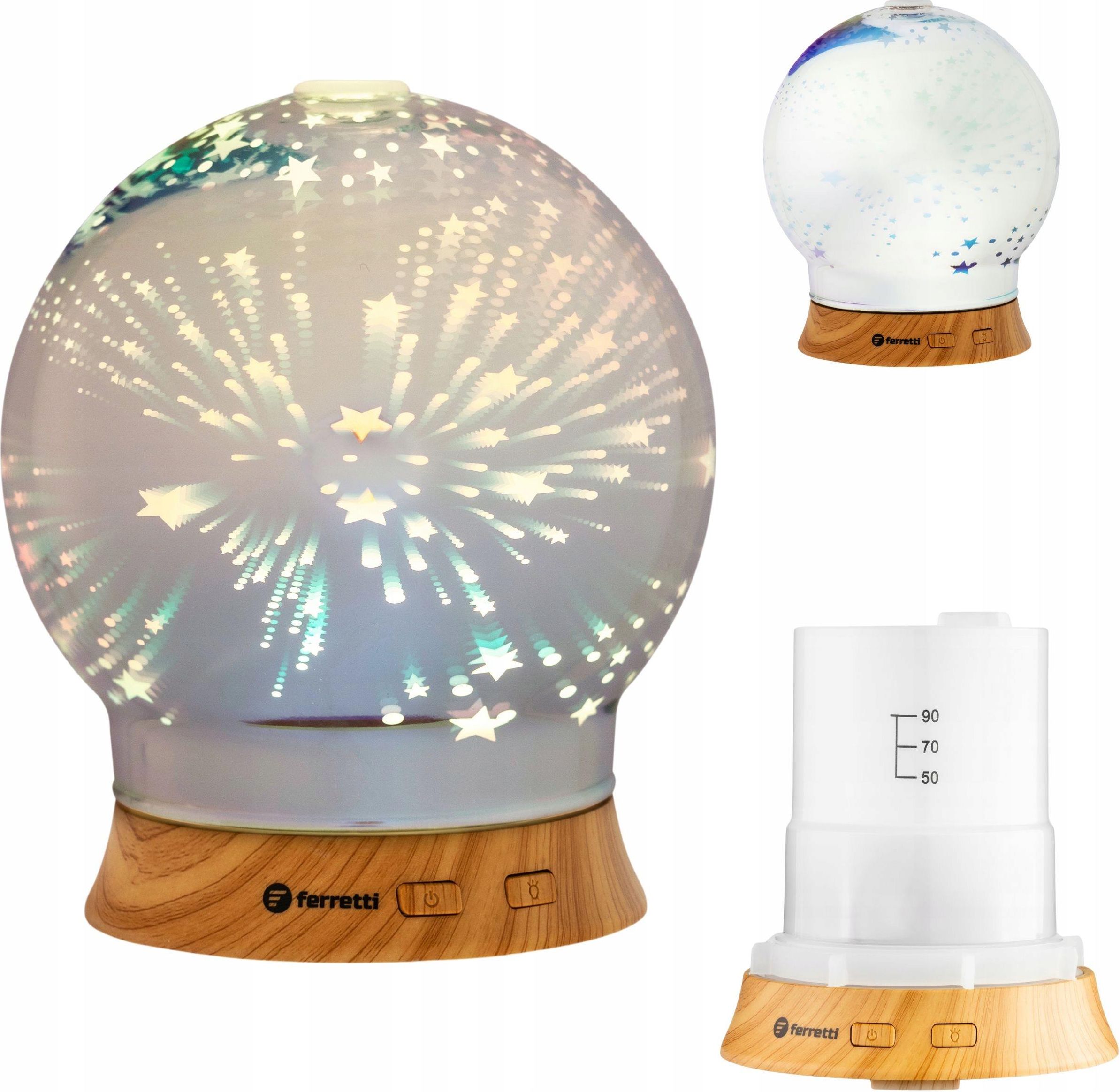 Dyfuzor zapachowy z funkcją aromaterapii Zalety korzystania z dyfuzora Ferretti Poprawia jakość powietrza Może wpłynąć pozytywnie na samopoczucie, uspokoić, pomóc w relaksie, a nawet usprawnić zasypianie, Po dodaniu odrobiny olejku eterycznego aromatyzuje Twój dom pięknym zapachem Upiększa Twoje wnętrza Dyfuzor rozpyli olejki eteryczne w pomieszczeniu na powierzchni do 40m2, Nawilża powietrze, co pomaga w walce z suchym kaszlem, problemami z gardłem, czy suchą skórą. Aż 5 różnych kolorów podświetlenia Dodatkowo Zapewnia niespotykany efekt świetlny, Może działać jako lampka nocna, Dyfuzor rozpyla olejki eteryczne, Zasilany USB, jest lekki, mały co pozwala umieścić go w domu, w biurze czy na balkonie, Oświetlenie LED 7 kolorów pozwala bardzo oszczędnie gospodarować Twoim portfelem Klosz jest szklany Specyfikacja Zasilanie 5V z kablem USB Tylko 7W Pojemność zbiornika 100ml Automatyczne wyłączanie, gdy woda się skończy Z efektem zimnej mgiełki Podświetlenie LED jest w różnych kolorach Pozwól sobie na odrobinę magii w swoim wnętrzu! Nasz kulisty dyfuzor zapachowy to coś więcej niż zwykły nawilżacz – to połączenie relaksu, stylu i niezwykłego nastroju. Ten stylowy dyfuzor zapachowy o kulistym kształcie to nie tylko urządzenie do aromaterapii, ale również efektowny element dekoracyjny. Dzięki wbudowanemu podświetleniu LED z paletą 7 kolorów, pełni również funkcję nastrojowej lampki, doskonale komponując się z wnętrzami zarówno klasycznymi, jak i nowoczesnymi. Wyróżnia go unikalny efekt gwiazd, który po włączeniu podświetlenia tworzy wewnątrz kuli wyjątkową, niemal magiczną atmosferę. Delikatna mgiełka zapachowa rozpraszana przez urządzenie sprzyja relaksowi, poprawia samopoczucie i wprowadza przyjemną aurę do pomieszczenia.